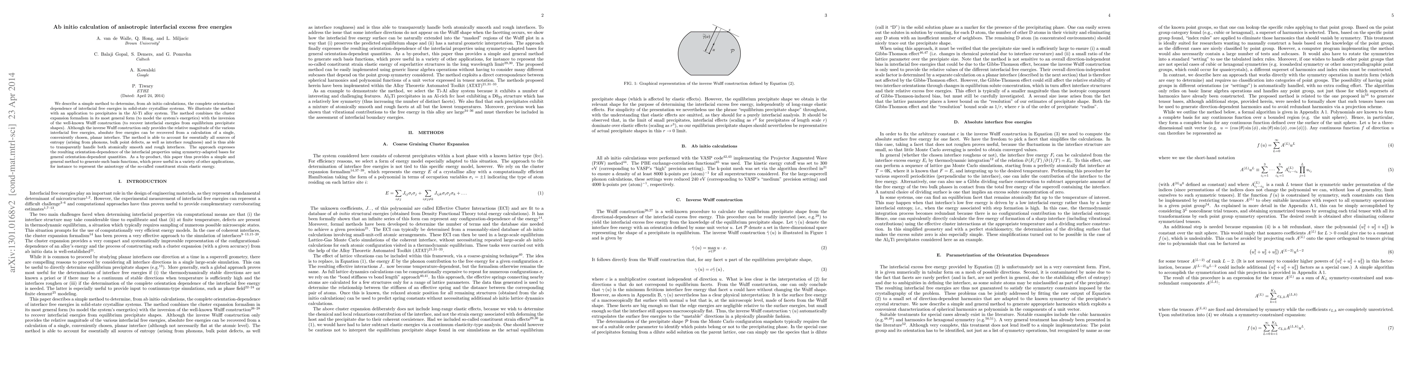 This paper presents an ab initio method to determine the orientation-dependent interfacial excess free energies in crystalline systems, illustrated with Al-Ti alloy precipitates. The method combines cluster expansion and the inverse Wulff construction, accounting for various entropy sources and providing a general approach to generate symmetry-adapted basis functions for anisotropic interfacial properties.