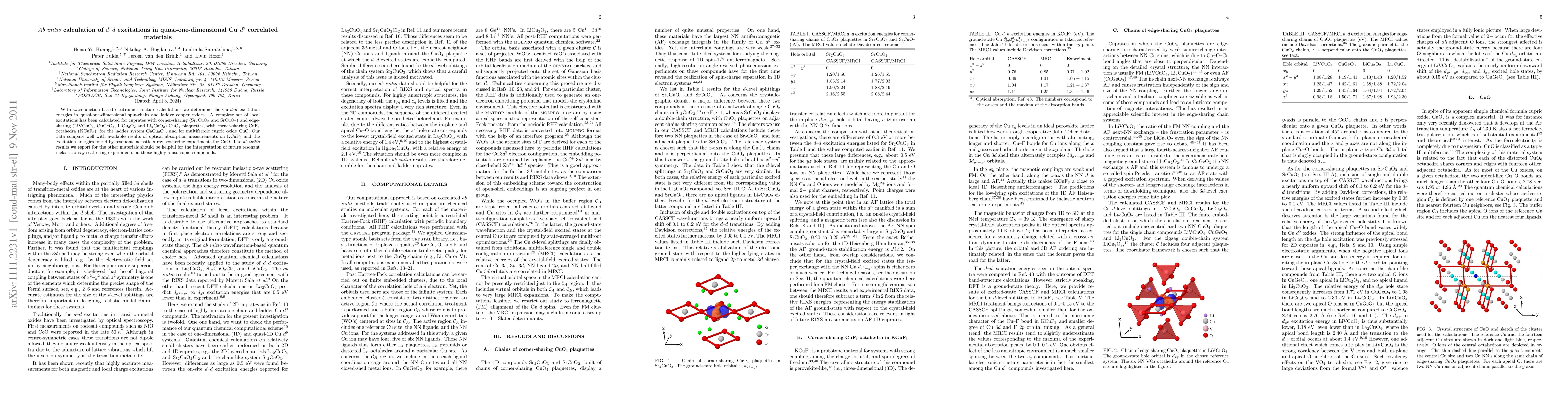 With wavefunction-based electronic-structure calculations we determine the Cu d-d excitation energies in quasi-one-dimensional spin-chain and ladder copper oxides. A complete set of local excitations has been calculated for cuprates with corner-sharing (Sr2CuO3 and SrCuO2) and edge-sharing (LiVCuO4, CuGeO3, LiCu2O2 and Li2CuO2) CuO4 plaquettes, with corner-sharing CuF6 octahedra (KCuF3), for the ladder system CaCu2O3, and for multiferroic cupric oxide CuO. Our data compare well with available results of optical absorption measurements on KCuF3 and the excitation energies found by resonant inelastic x-ray scattering experiments for CuO. The ab initio results we report for the other materials should be helpful for the interpretation of future resonant inelastic x-ray scattering experiments on those highly anisotropic compounds.