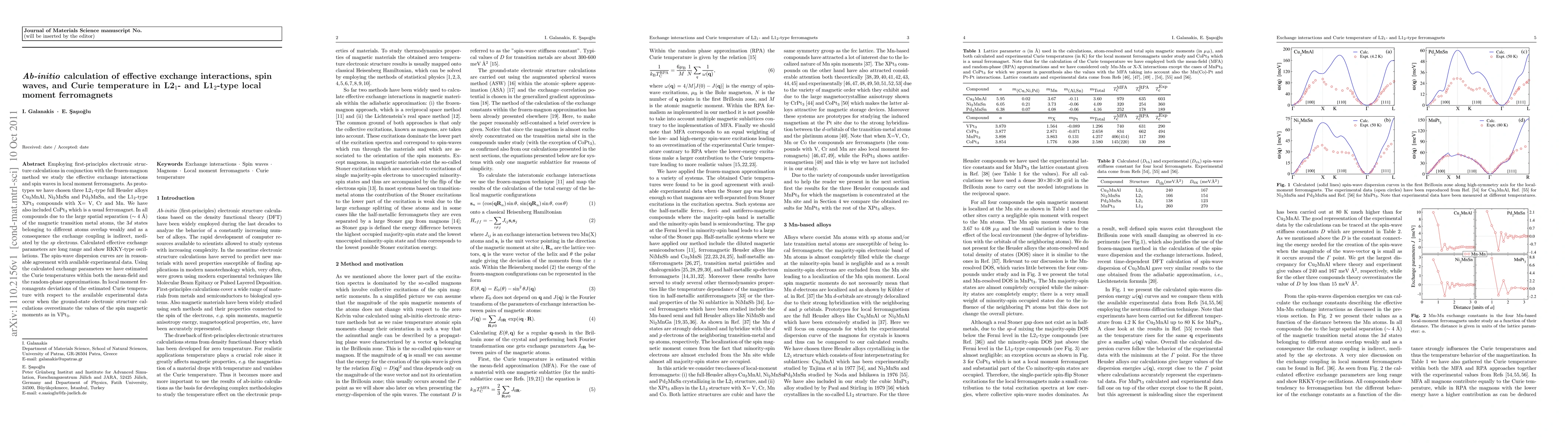 Researchers used first-principles calculations to study ferromagnetism in alloys and compounds, finding that effective exchange interactions and spin waves behave similarly to RKKY-type oscillations, with estimated Curie temperatures varying from agreement to discrepancies based on electronic structure calculations.