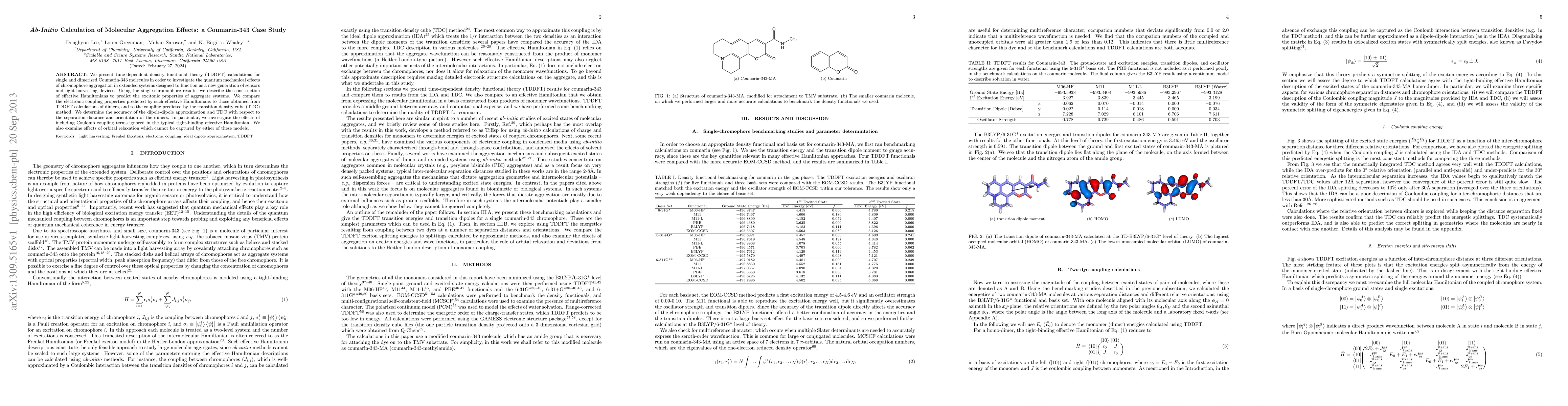 We present time-dependent density functional theory (TDDFT) calculations for single and dimerized Coumarin-343 molecules in order to investigate the quantum mechanical effects of chromophore aggregation in extended systems designed to function as a new generation of sensors and light-harvesting devices. Using the single-chromophore results, we describe the construction of effective Hamiltonians to predict the excitonic properties of aggregate systems. We compare the electronic coupling properties predicted by such effective Hamiltonians to those obtained from TDDFT calculations of dimers, and to the coupling predicted by the transition density cube (TDC) method. We determine the accuracy of the dipole-dipole approximation and TDC with respect to the separation distance and orientation of the dimers. In particular, we investigate the effects of including Coulomb coupling terms ignored in the typical tight-binding effective Hamiltonian. We also examine effects of orbital relaxation which cannot be captured by either of these models.