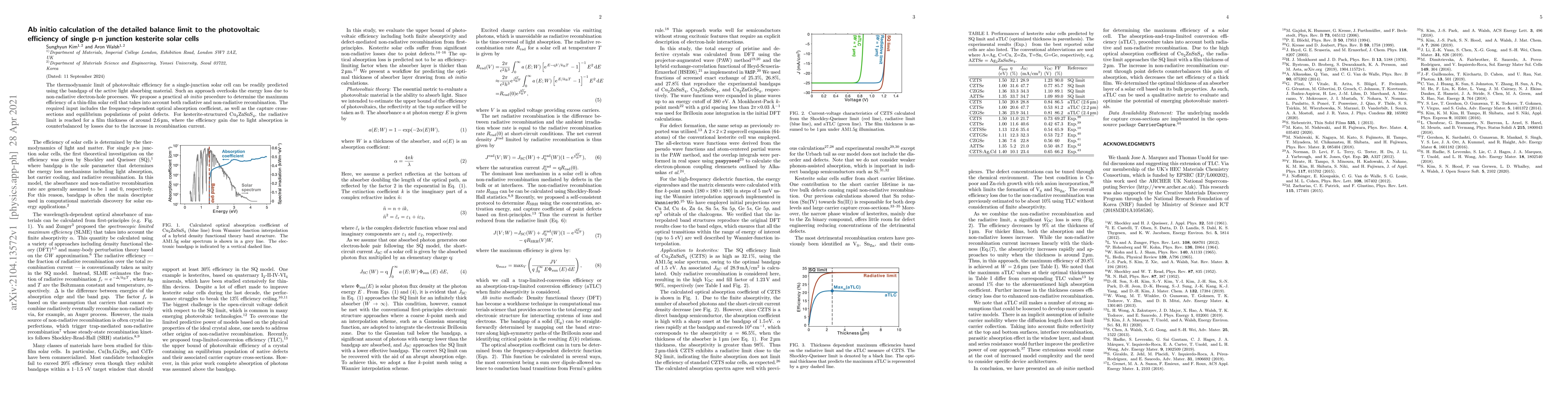 This paper proposes an ab initio method to calculate the detailed balance limit for photovoltaic efficiency in single p-n junction kesterite solar cells, considering both radiative and non-radiative recombination losses. For Cu$_2$ZnSnS$_4$, the optimal efficiency is achieved at a film thickness of approximately 2.6 micrometers.