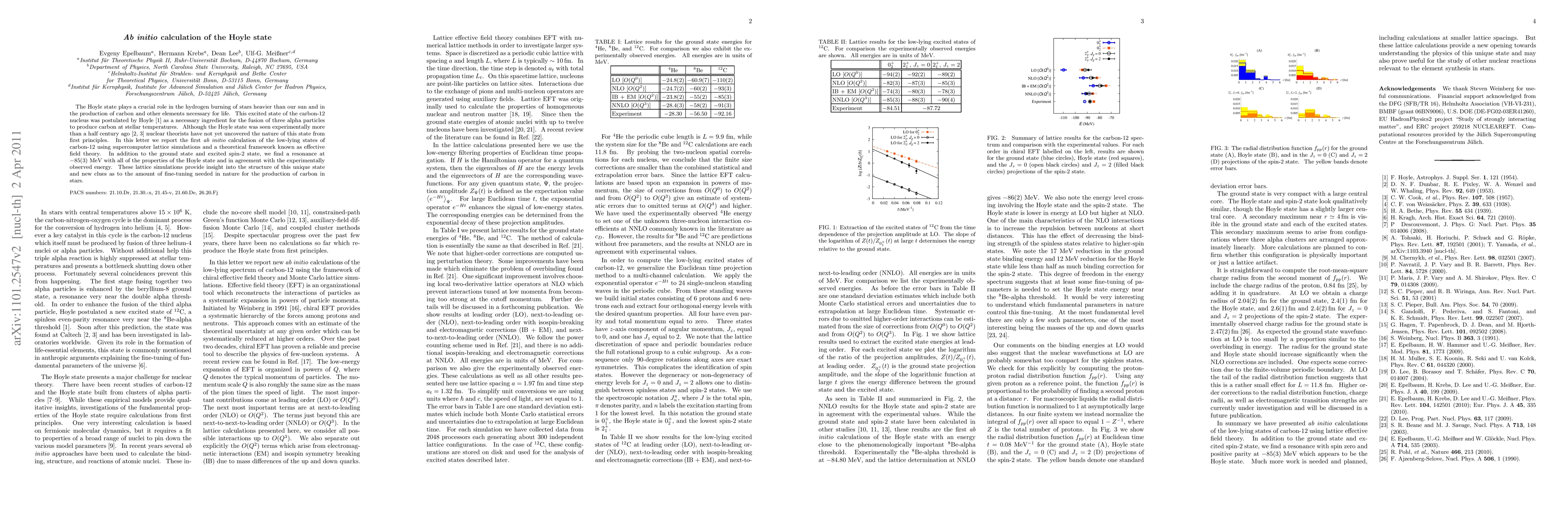 This paper reports the first ab initio calculation of the low-lying states of carbon-12 using supercomputer simulations, identifying a resonance at -85(3) MeV that matches the experimentally observed Hoyle state, crucial for carbon production in stars. The findings provide new insights into the structure of the Hoyle state and the fine-tuning necessary for stellar nucleosynthesis.