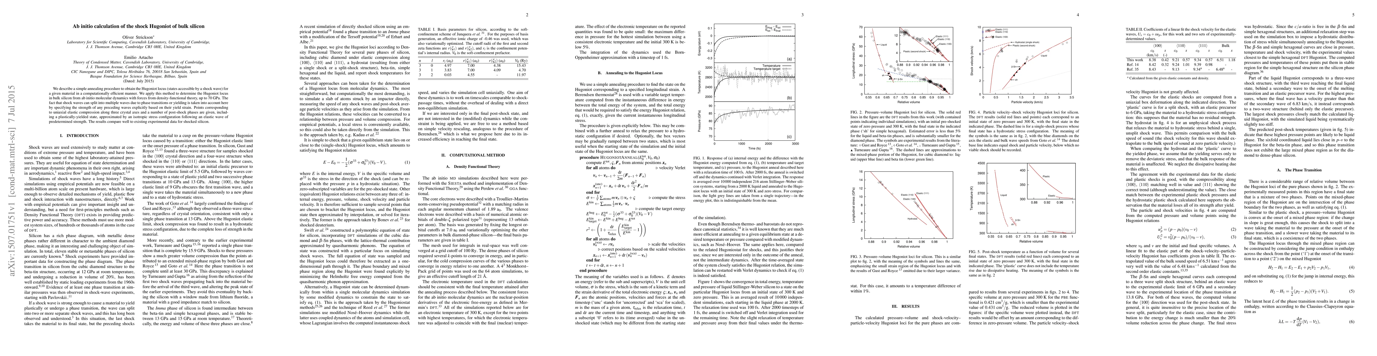 We describe a simple annealing procedure to obtain the Hugoniot locus (states accessible by a shock wave) for a given material in a computationally efficient manner. We apply this method to determine the Hugoniot locus in bulk silicon from ab initio molecular dynamics with forces from density-functional theory, up to 70 GPa. The fact that shock waves can split into multiple waves due to phase transitions or yielding is taken into account here by specifying the strength of any preceding waves explicitly based on their yield strain. Points corresponding to uniaxial elastic compression along three crystal axes and a number of post-shock phases are given, including a plastically-yielded state, approximated by an isotropic stress configuration following an elastic wave of predetermined strength. The results compare well to existing experimental data for shocked silicon.
