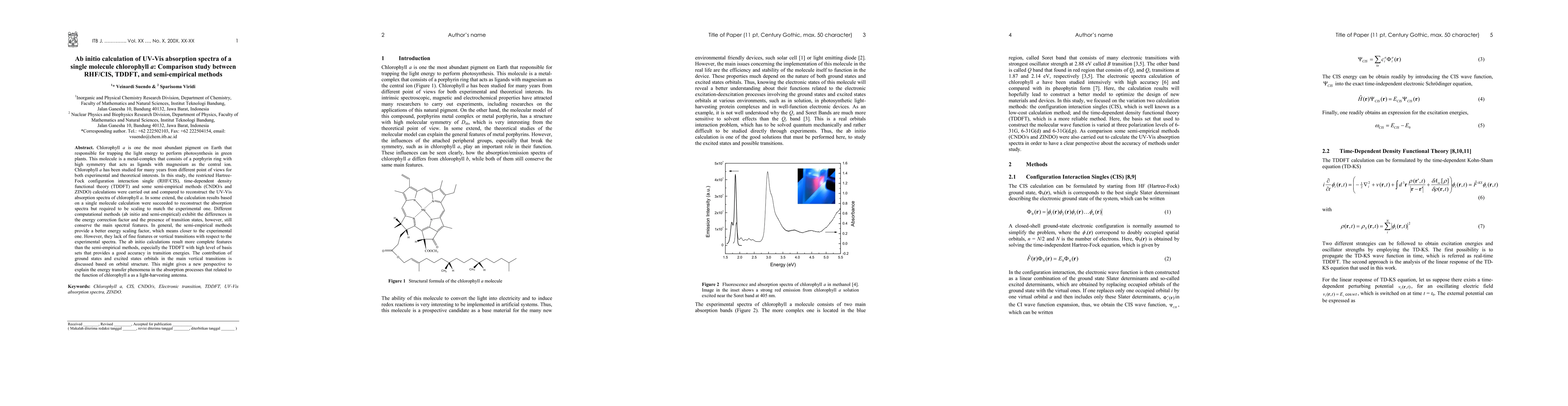 Chlorophyll a is one the most abundant pigment on Earth that responsible for trapping the light energy to perform photosynthesis in green plants. This molecule is a metal-complex that consists of a porphyrin ring with high symmetry that acts as ligands with magnesium as the central ion. Chlorophyll a has been studied for many years from different point of views for both experimental and theoretical interests. In this study, the restricted Hartree-Fock configuration interaction single (RHF/CIS), time-dependent density functional theory (TDDFT) and some semi-empirical methods (CNDO/s and ZINDO) calculations were carried out and compared to reconstruct the UV-Vis absorption spectra of chlorophyll a. In some extend, the calculation results based on a single molecule calculation were succeeded to reconstruct the absorption spectra but required to be scaling to match the experimental one. Different computational methods (ab initio and semi-empirical) exhibit the differences in the energy correction factor and the presence of transition states, however, still conserve the main spectral features. In general, the semi-empirical methods provide a better energy scaling factor, which means closer to the experimental one. However, they lack of fine features or vertical transitions with respect to the experimental spectra. The ab initio calculations result more complete features than the semi-empirical methods, especially the TDDFT with high level of basis sets that provides a good accuracy in transition energies. The contribution of ground states and excited states orbitals in the main vertical transitions is discussed based on orbital structure. This might gives a new perspective to explain the energy transfer phenomena in the absorption processes that related to the function of chlorophyll a as a light-harvesting antenna.