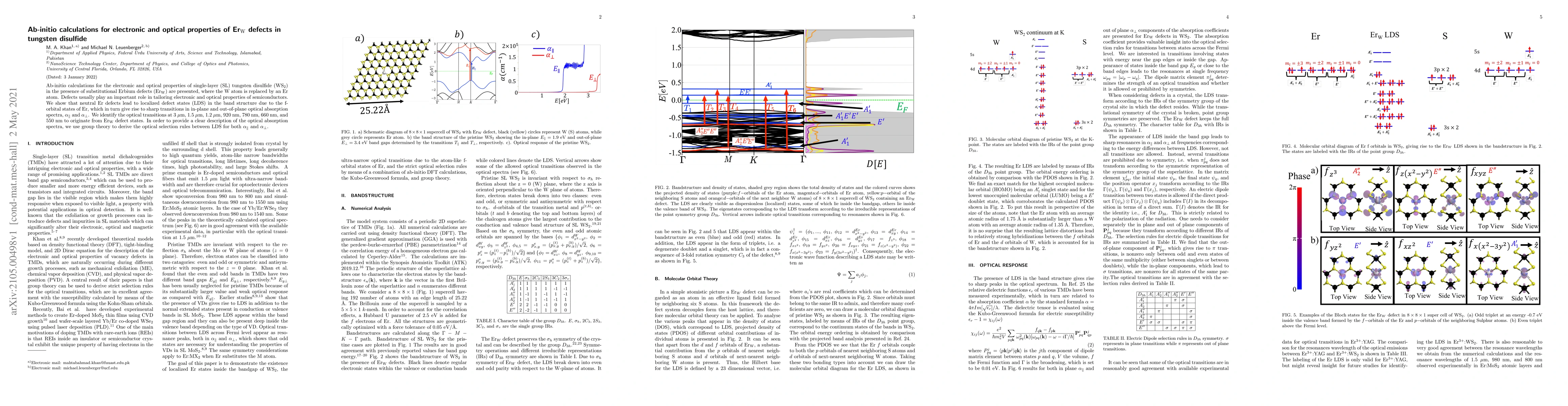 This paper presents ab-initio calculations on the electronic and optical properties of single-layer tungsten disulfide (WS$_2$) with substitutional Erbium defects. The study reveals that neutral Er$_{\rm W}$ defects create localized defect states leading to sharp transitions in optical absorption spectra, identified at various wavelengths.