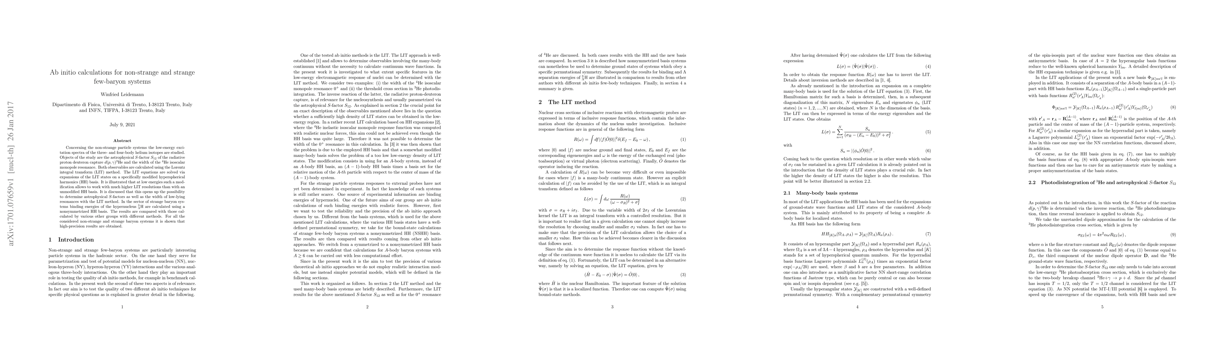 Concerning the non-strange particle systems the low-energy excitation spectra of the three- and four-body helium isotopes are studied. Objects of the study are the astrophysical $S$-factor $S_{12}$ of the radiative proton deuteron capture $d(p,\gamma)^3$He and the width of the $^4$He isoscalar monopole resonance.Both observables are calculated using the Lorentz integral transform (LIT) method. The LIT equations are solved via expansions of the LIT states on a specifically modified hyperspherical harmonics (HH) basis. It is illustrated that at low energies such a modification allows to work with much higher LIT resolutions than with an unmodified HH basis. It is discussed that this opens up the possibility to determine astrophysical $S$-factors as well as the width of low-lying resonances with the LIT method. In the sector of strange baryon systems binding energies of the hypernucleus $^3_\Lambda$H are calculated using a nonsymmetrized HH basis. The results are compared with those calculated by various other groups with different methods. For all the considered non-strange and strange baryon systems it is shown that high-precision results are obtained.