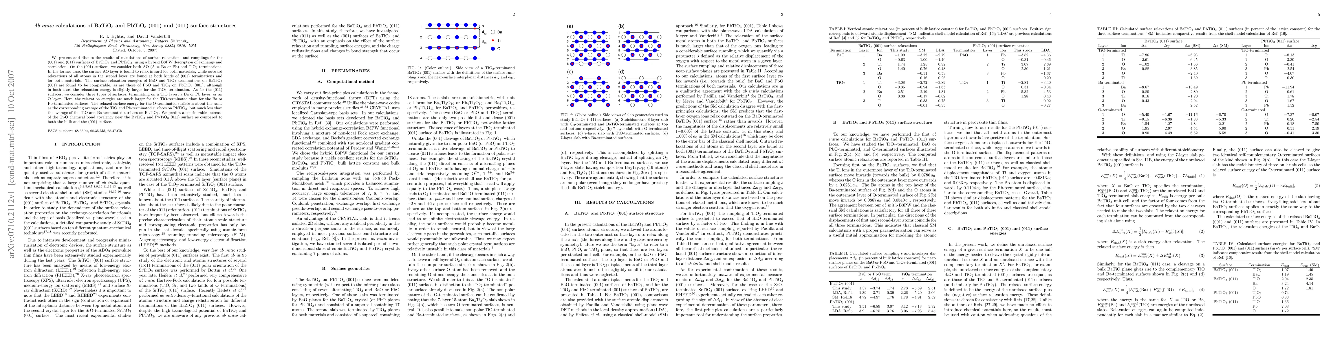 This study uses hybrid B3PW calculations to analyze surface relaxations and rumplings for BaTiO3 and PbTiO3 (001) and (011) surfaces. On (001) surfaces, the surface AO layer relaxes inward, while the second layer atoms relax outward, with slightly higher relaxation energy for TiO2 terminations. For (011) surfaces, TiO-terminated surfaces exhibit significantly higher relaxation energies compared to Ba or Pb-terminated ones, and the O-terminated surface has lower relaxation energy than the TiO-terminated surface in BaTiO3.