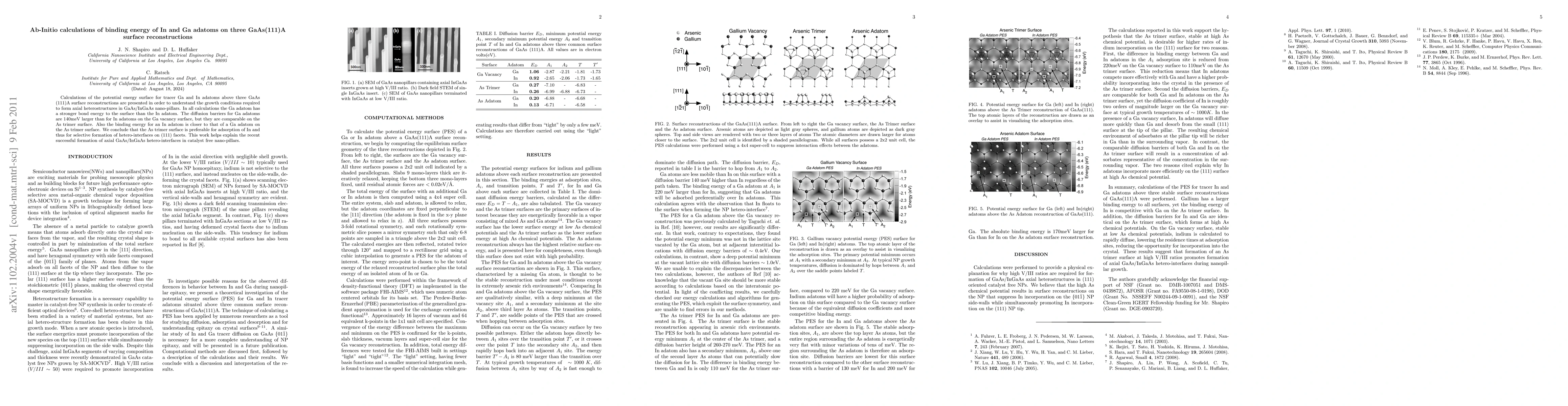 This study uses ab-initio calculations to compare the binding energy and diffusion barriers of Ga and In adatoms on three GaAs(111)A surface reconstructions, revealing that Ga adatoms bond more strongly and have higher diffusion barriers than In adatoms, except on the As trimer surface where they are comparable. The As trimer surface is identified as preferable for In adatom adsorption, aiding the formation of axial hetero-interfaces in GaAs/InGaAs nano-pillars.