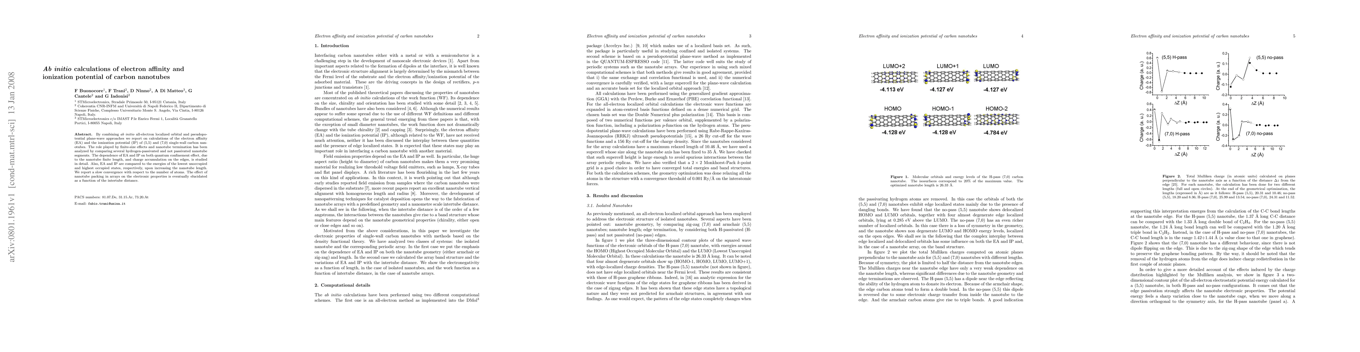 This paper uses ab initio methods to calculate the electron affinity and ionization potential of (5, 5) and (7, 0) single-wall carbon nanotubes, analyzing the influence of finite-size effects, nanotube termination, and packing in arrays. It finds slow convergence with nanotube length and examines how quantum confinement and edge charge accumulation affect these properties.