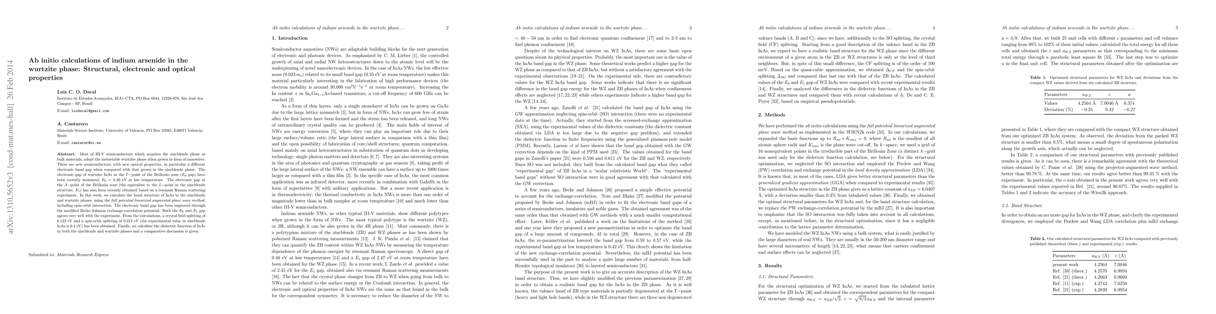 This paper uses ab initio calculations to investigate the structural, electronic, and optical properties of indium arsenide (InAs) in both zinc-blende and wurtzite phases. The study reveals significant differences in electronic band gaps and optical properties between the two phases, with the wurtzite phase showing a lower E0 gap of 0.46 eV and a spin-orbit splitting of 0.312 eV.