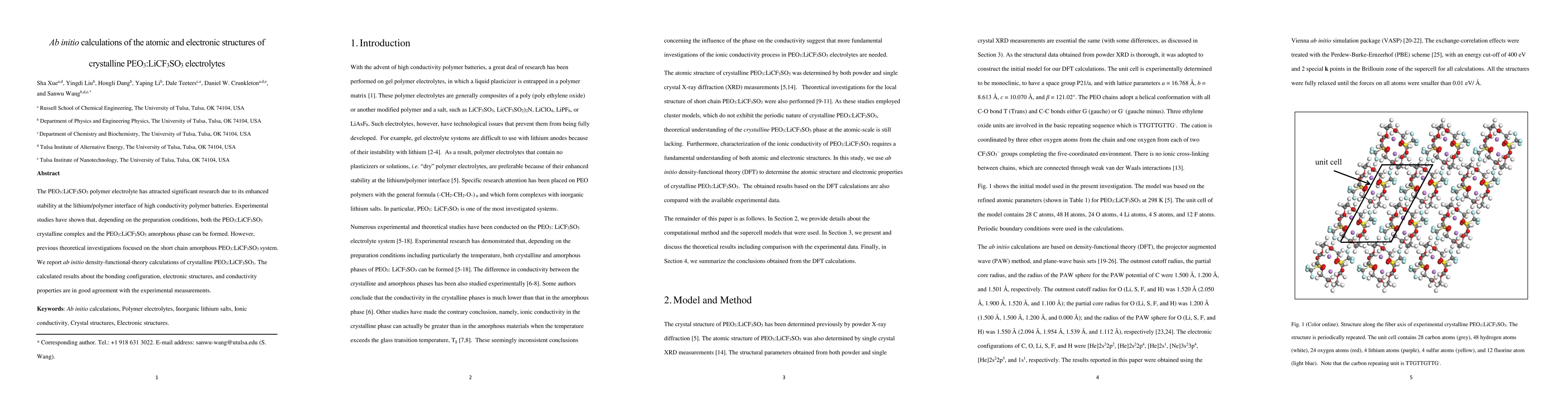 This paper reports ab initio density-functional-theory calculations of the crystalline PEO3:LiCF3SO3 polymer electrolyte, providing insights into its atomic and electronic structures, and confirming the results with experimental measurements. The study highlights the enhanced stability and conductivity properties of this crystalline complex.