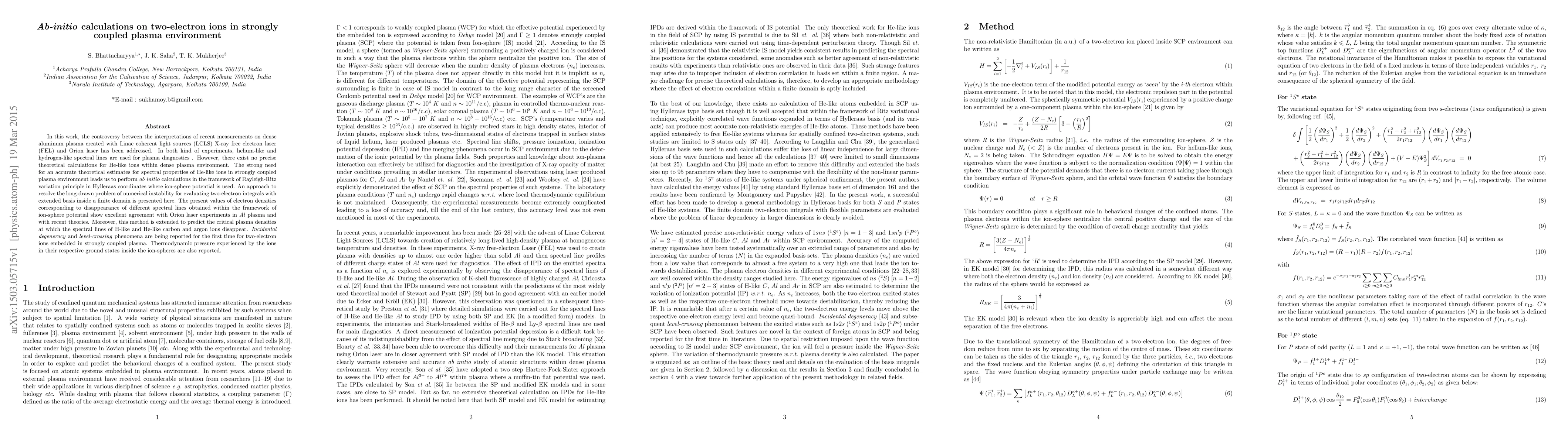 In this work, the controversy between the interpretations of recent measurements on dense aluminum plasma created with Linac coherent light sources (LCLS) X-ray free electron laser (FEL) and Orion laser has been addressed. In both kind of experiments, helium-like and hydrogen-like spectral lines are used for plasma diagnostics . However, there exist no precise theoretical calculations for He-like ions within dense plasma environment. The strong need for an accurate theoretical estimates for spectral properties of He-like ions in strongly coupled plasma environment leads us to perform ab initio calculations in the framework of Rayleigh-Ritz variation principle in Hylleraas coordinates where ion-sphere potential is used. An approach to resolve the long-drawn problem of numerical instability for evaluating two-electron integrals with extended basis inside a finite domain is presented here. The present values of electron densities corresponding to disappearance of different spectral lines obtained within the framework of ion-sphere potential show excellent agreement with Orion laser experiments in Al plasma and with recent theories. Moreover, this method is extended to predict the critical plasma densities at which the spectral lines of H-like and He-like carbon and argon ions disappear. Incidental degeneracy and level-crossing phenomena are being reported for the first time for two-electron ions embedded in strongly coupled plasma. Thermodynamic pressure experienced by the ions in their respective ground states inside the ion-spheres are also reported.