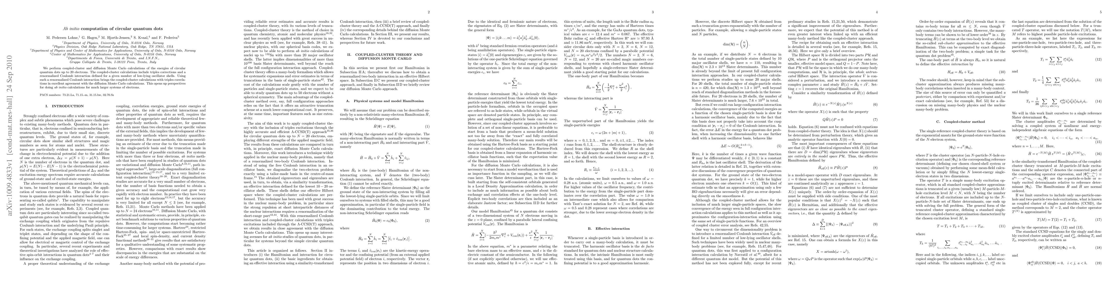 This paper reports ab initio calculations using coupled-cluster and diffusion Monte Carlo methods to determine the energies of circular quantum dots up to 20 electrons, achieving excellent agreement through the use of a renormalized Coulomb interaction, which paves the way for future calculations on larger systems.
