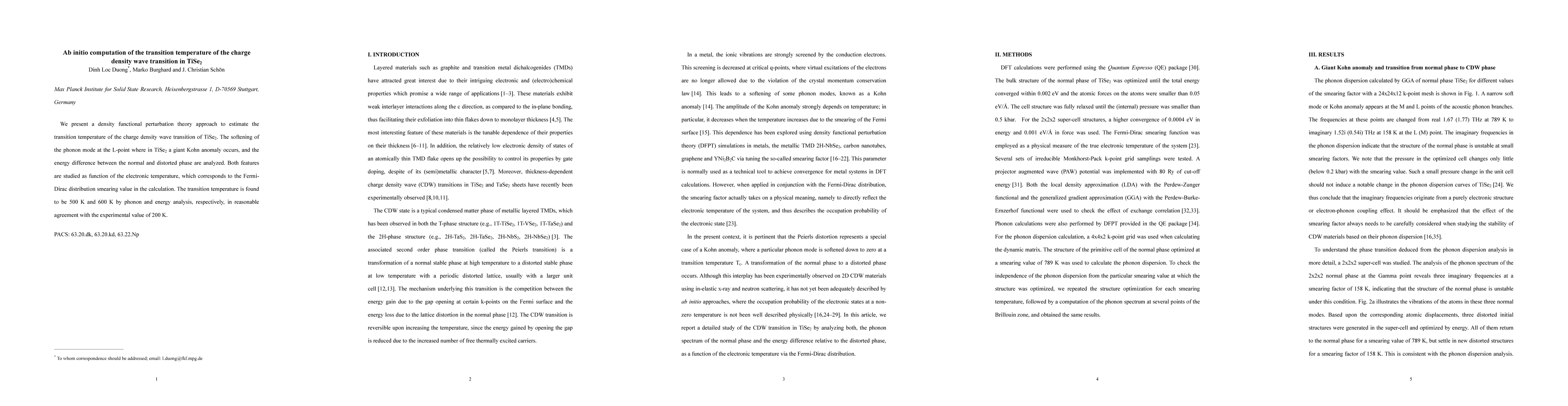 We present a density functional perturbation theory approach to estimate the transition temperature of the charge density wave transition of TiSe2. The softening of the phonon mode at the L-point where in TiSe2 a giant Kohn anomaly occurs, and the energy difference between the normal and distorted phase are analyzed. Both features are studied as function of the electronic temperature, which corresponds to the Fermi-Dirac distribution smearing value in the calculation. The transition temperature is found to be 500 K and 600 K by phonon and energy analysis, respectively, in reasonable agreement with the experimental value of 200 K.