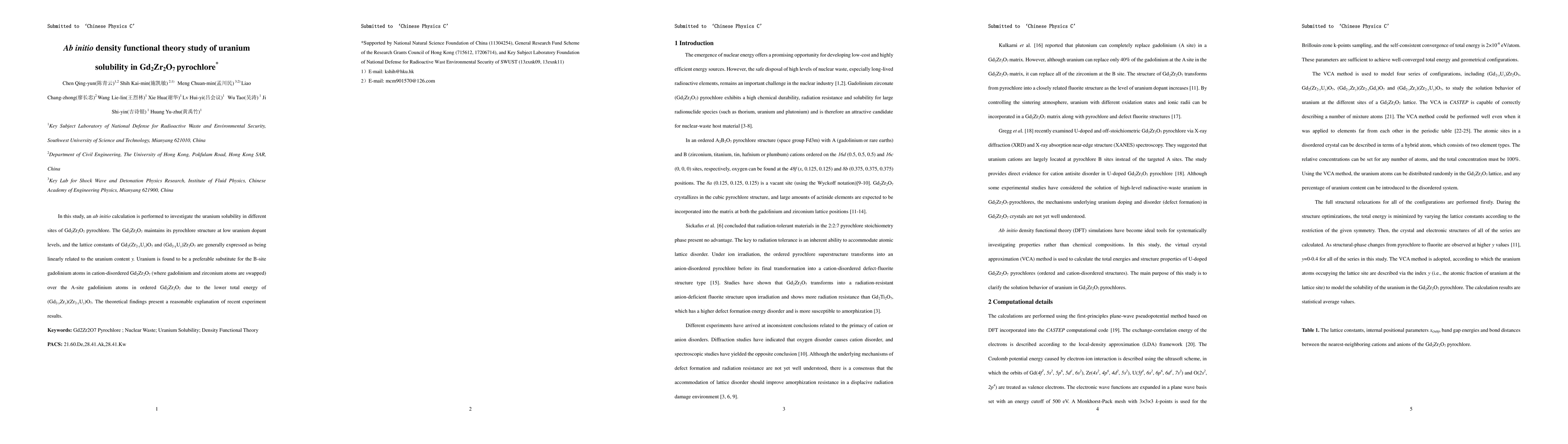 This study uses ab initio density functional theory to determine uranium solubility in Gd2Zr2O7 pyrochlore, finding that uranium prefers substitution at the B-site over the A-site due to lower total energy, maintaining the pyrochlore structure at low doping levels.