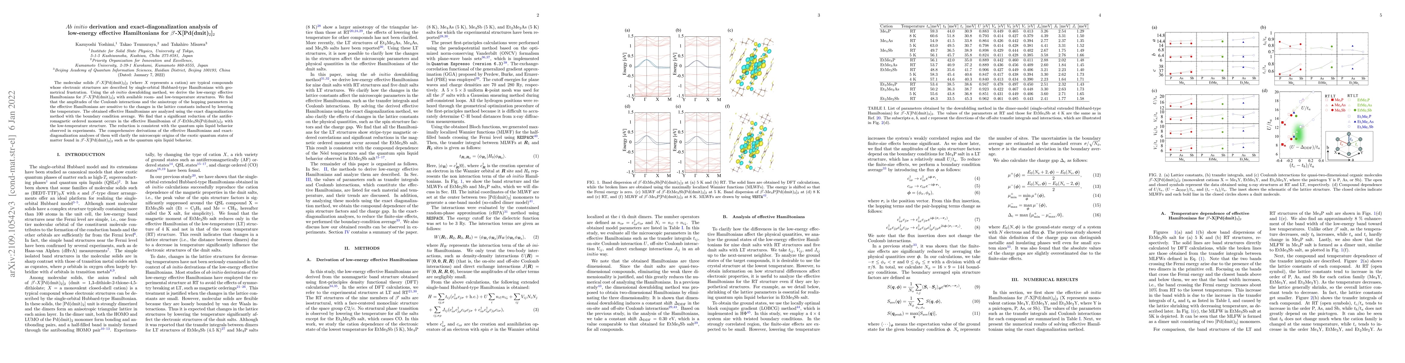 This paper derives low-energy effective Hamiltonians for $\beta^\prime$-$X$[Pd(dmit)$_2$]$_2$ using $ab$ initio downfolding and analyzes them via exact diagonalization. The study reveals that temperature-induced lattice changes affect Coulomb interactions and hopping parameters, leading to a significant reduction in the antiferromagnetic ordered moment in $\beta^\prime$-EtMe$_3$Sb[Pd(dmit)$_2$]$_2$, consistent with observed quantum spin liquid behavior.