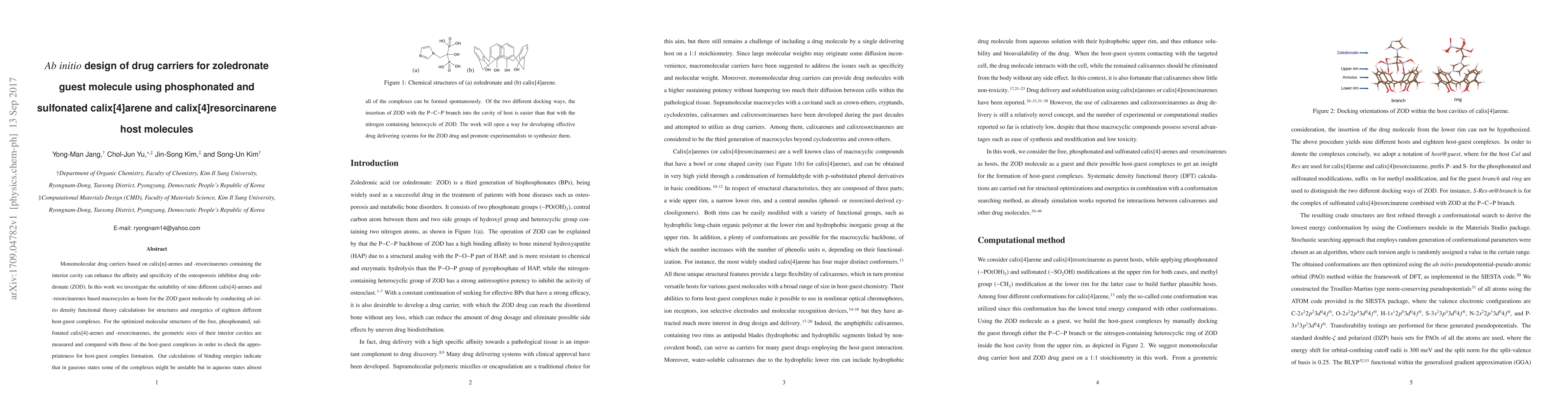Monomolecular drug carriers based on calix[n]-arenes and -resorcinarenes containing the interior cavity can enhance the affinity and specificity of the osteoporosis inhibitor drug zoledronate (ZOD). In this work we investigate the suitability of nine different calix[4]-arenes and -resorcinarenes based macrocycles as hosts for the ZOD guest molecule by conducting {\it ab initio} density functional theory calculations for structures and energetics of eighteen different host-guest complexes. For the optimized molecular structures of the free, phosphonated, sulfonated calix[4]-arenes and -resorcinarenes, the geometric sizes of their interior cavities are measured and compared with those of the host-guest complexes in order to check the appropriateness for host-guest complex formation. Our calculations of binding energies indicate that in gaseous states some of the complexes might be unstable but in aqueous states almost all of the complexes can be formed spontaneously. Of the two different docking ways, the insertion of ZOD with the \ce{P-C-P} branch into the cavity of host is easier than that with the nitrogen containing heterocycle of ZOD. The work will open a way for developing effective drug delivering systems for the ZOD drug and promote experimentalists to synthesize them.