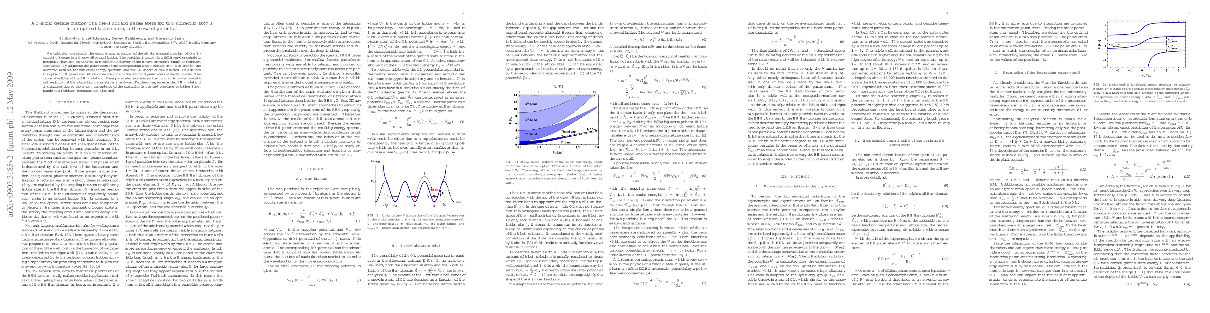 This paper provides an ab-initio calculation of the optimal Bose-Hubbard parameters for two ultracold Bosons in a three-well optical lattice, minimizing the deviation between the exact numerical energy spectrum and the BH model spectrum. It also discusses the extended BH model and implications of energy-dependent scattering lengths and higher Bloch bands at Feshbach resonances.