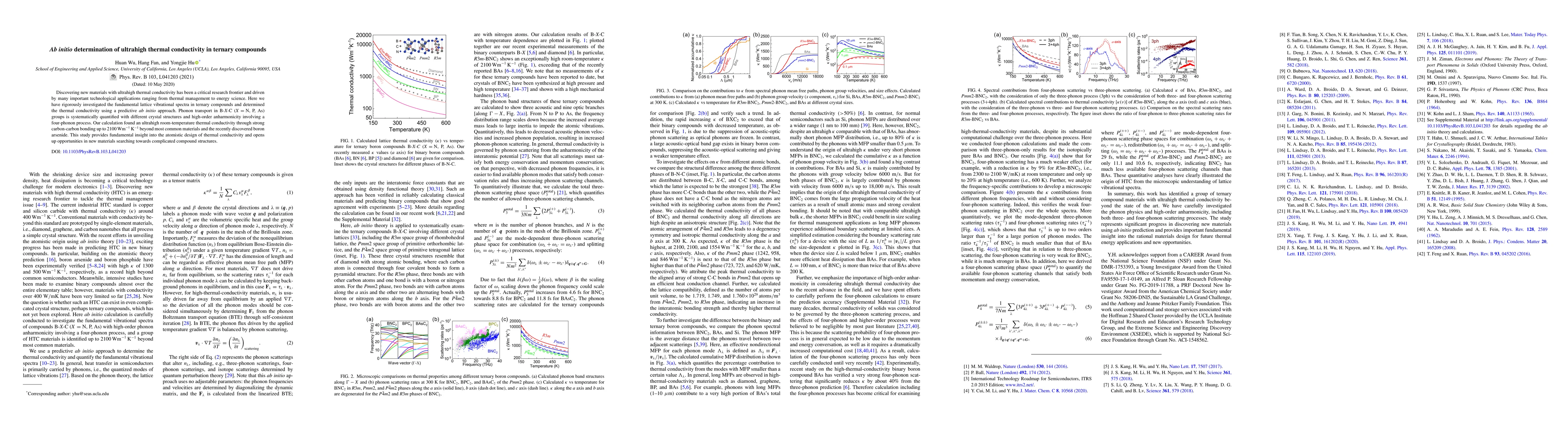 This research explores ternary compounds (B-X-C) with ultrahigh thermal conductivity via ab initio calculations, identifying strong carbon-carbon bonding in structures like boron arsenide as a key factor for conductivity up to 2100 W/mK, surpassing many conventional materials. The study provides foundational insights for designing materials with superior thermal management capabilities.