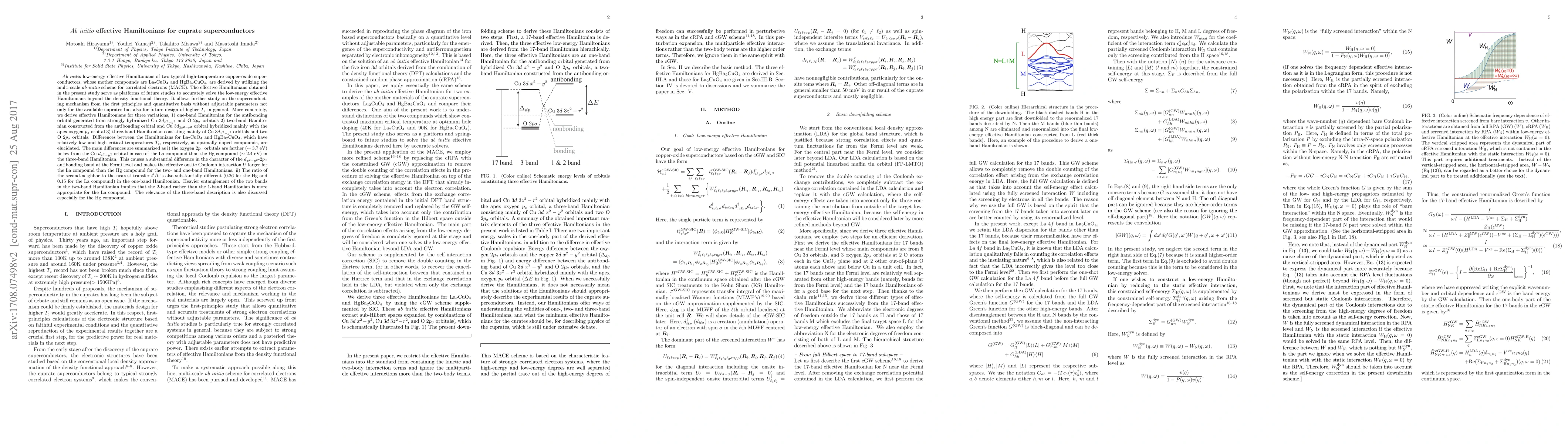 This paper derives ab initio low-energy effective Hamiltonians for two high-temperature copper-oxide superconductors, La$_2$CuO$_4$ and HgBa$_2$CuO$_4$, using the MACE scheme. It provides a platform for future studies on superconductivity without adjustable parameters, revealing differences in their superconducting mechanisms.