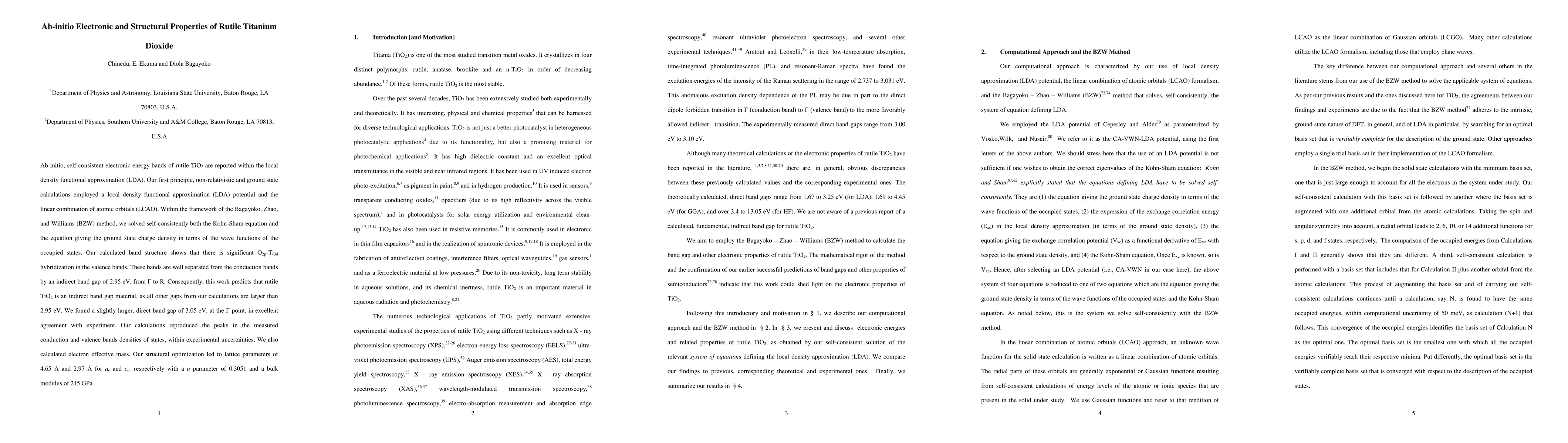 Researchers calculated electronic and structural properties of rutile titanium dioxide using ab-initio methods, finding a 2.95eV indirect band gap and a 3.05eV direct band gap at the Gamma point, in agreement with experimental results.