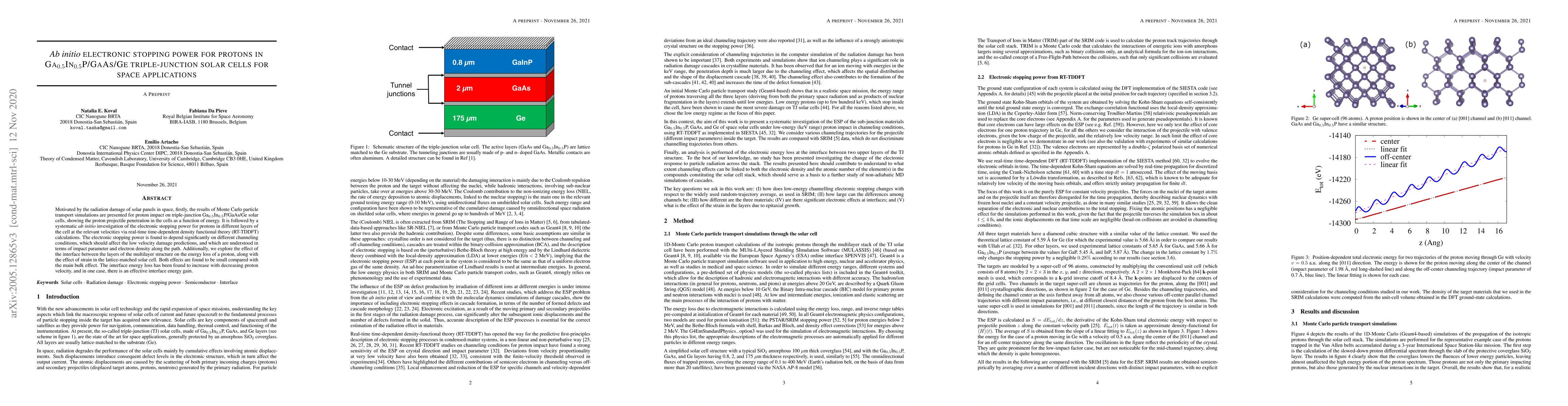 Motivated by the radiation damage of solar panels in space, firstly, the results of Monte Carlo particle transport simulations are presented for proton impact on triple-junction Ga$_{0.5}$In$_{0.5}$P/GaAs/Ge solar cells, showing the proton projectile penetration in the cells as a function of energy. It is followed by a systematic {\it ab initio} investigation of the electronic stopping power for protons in different layers of the cell at the relevant velocities via real-time time-dependent density functional theory (RT-TDDFT) calculations. The electronic stopping power is found to depend significantly on different channeling conditions, which should affect the low velocity damage predictions, and which are understood in terms of impact parameter and electron density along the path. Additionally, we explore the effect of the interface between the layers of the multilayer structure on the energy loss of a proton, along with the effect of strain in the lattice-matched solar cell. Both effects are found to be small compared with the main bulk effect. The interface energy loss has been found to increase with decreasing proton velocity, and in one case, there is an effective interface energy gain.