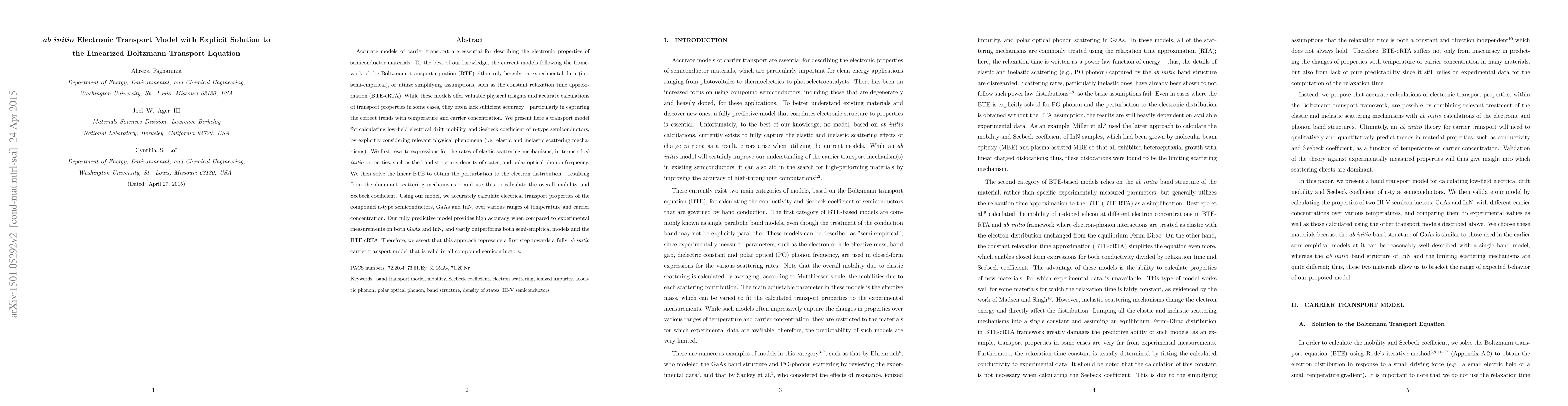 Accurate models of carrier transport are essential for describing the electronic properties of semiconductor materials. To the best of our knowledge, the current models following the framework of the Boltzmann transport equation (BTE) either rely heavily on experimental data (i.e., semi-empirical), or utilize simplifying assumptions, such as the constant relaxation time approximation (BTE-cRTA). While these models offer valuable physical insights and accurate calculations of transport properties in some cases, they often lack sufficient accuracy -- particularly in capturing the correct trends with temperature and carrier concentration. We present here a general transport model for calculating low-field electrical drift mobility and Seebeck coefficient of n-type semiconductors, by explicitly considering all relevant physical phenomena (i.e. elastic and inelastic scattering mechanisms). We first rewrite expressions for the rates of elastic scattering mechanisms, in terms of ab initio properties, such as the band structure, density of states, and polar optical phonon frequency. We then solve the linear BTE to obtain the perturbation to the electron distribution -- resulting from the dominant scattering mechanisms -- and use this to calculate the overall mobility and Seebeck coefficient. Using our model, we accurately calculate electrical transport properties of the compound n-type semiconductors, GaAs and InN, over various ranges of temperature and carrier concentration. Our fully predictive model provides high accuracy when compared to experimental measurements on both GaAs and InN, and vastly outperforms both semi-empirical models and the BTE-cRTA. Therefore, we assert that this approach represents a first step towards a fully ab initio carrier transport model that is valid in all compound semiconductors.