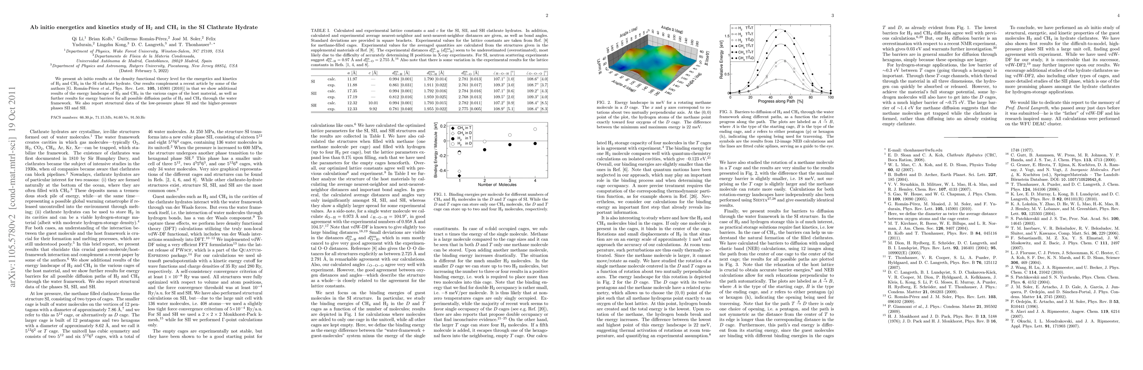 We present ab initio results at the density functional theory level for the energetics and kinetics of H_2 and CH_4 in the SI clathrate hydrate. Our results complement a recent article by some of the authors [G. Roman-Perez et al., Phys. Rev. Lett. 105, 145901 (2010)] in that we show additional results of the energy landscape of H_2 and CH_4 in the various cages of the host material, as well as further results for energy barriers for all possible diffusion paths of H_2 and CH_4 through the water framework. We also report structural data of the low-pressure phase SI and the higher-pressure phases SII and SH.