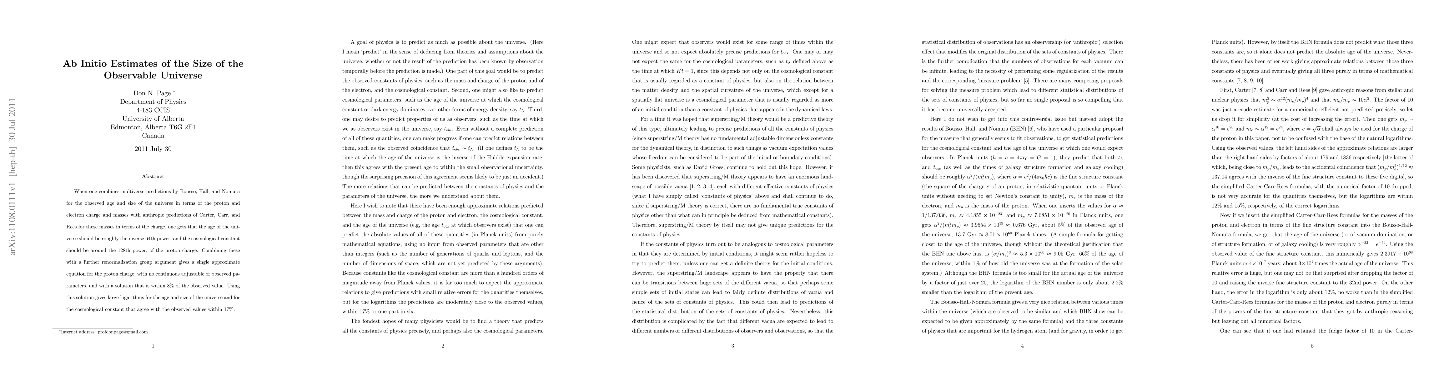 When one combines multiverse predictions by Bousso, Hall, and Nomura for the observed age and size of the universe in terms of the proton and electron charge and masses with anthropic predictions of Carter, Carr, and Rees for these masses in terms of the charge, one gets that the age of the universe should be roughly the inverse 64th power, and the cosmological constant should be around the 128th power, of the proton charge. Combining these with a further renormalization group argument gives a single approximate equation for the proton charge, with no continuous adjustable or observed parameters, and with a solution that is within 8% of the observed value. Using this solution gives large logarithms for the age and size of the universe and for the cosmological constant that agree with the observed values within 17%.