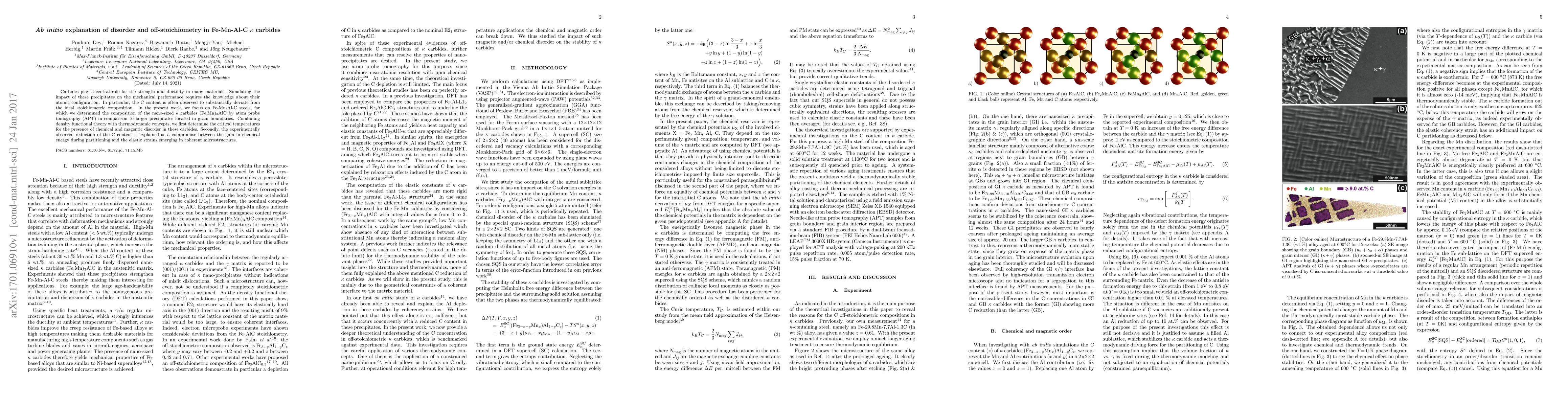Carbides play a central role for the strength and ductility in many materials. Simulating the impact of these precipitates on the mechanical performance requires the knowledge about their atomic configuration. In particular, the C content is often observed to substantially deviate from the ideal stoichiometric composition. In the present work, we focus on Fe-Mn-Al-C steels, for which we determined the composition of the nano-sized kappa carbides (Fe,Mn)3AlC by atom probe tomography (APT) in comparison to larger precipitates located in grain boundaries. Combining density functional theory with thermodynamic concepts, we first determine the critical temperatures for the presence of chemical and magentic disorder in these carbides. Secondly, the experimentally observed reduction of the C content is explained as a compromise between the gain in chemical energy during partitioning and the elastic strains emerging in coherent microstructures.