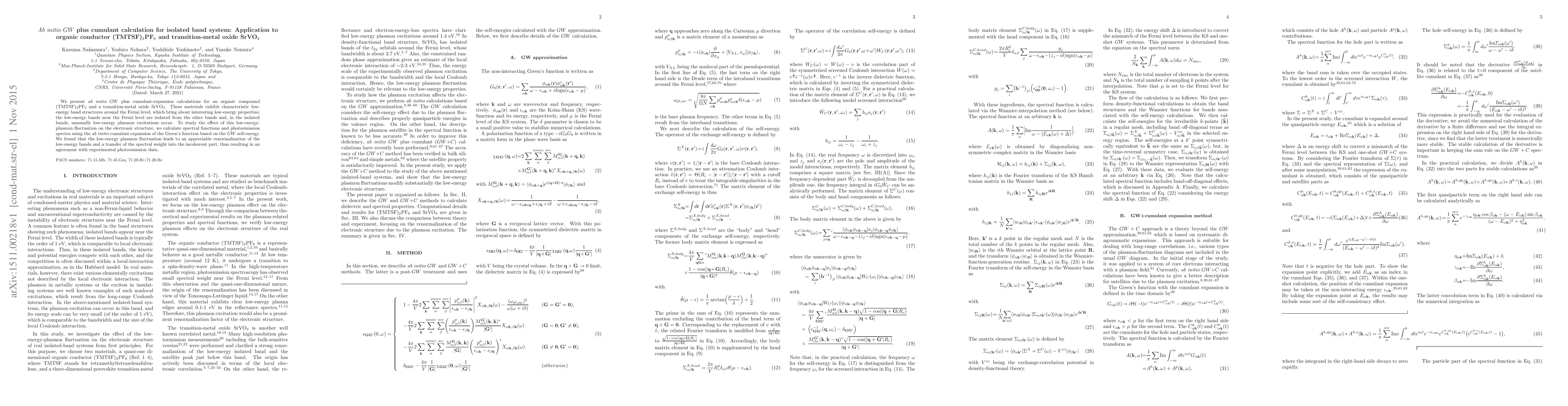 We present ab initio GW plus cumulant-expansion calculations for an organic compound (TMTSF)2PF6 and a transition-metal oxide SrVO3. These materials exhibit characteristic low-energy band structures around the Fermi level, which bring about interesting low-energy properties; the low-energy bands near the Fermi level are isolated from the other bands and, in the isolated bands, unusually low-energy plasmon excitations occur. To study the effect of this low-energy-plasmon fluctuation on the electronic structure, we calculate spectral functions and photoemission spectra using the ab initio cumulant expansion of the Green's function based on the GW self-energy. We found that the low-energy plasmon fluctuation leads to an appreciable renormalization of the low-energy bands and a transfer of the spectral weight into the incoherent part, thus resulting in an agreement with experimental photoemission data.