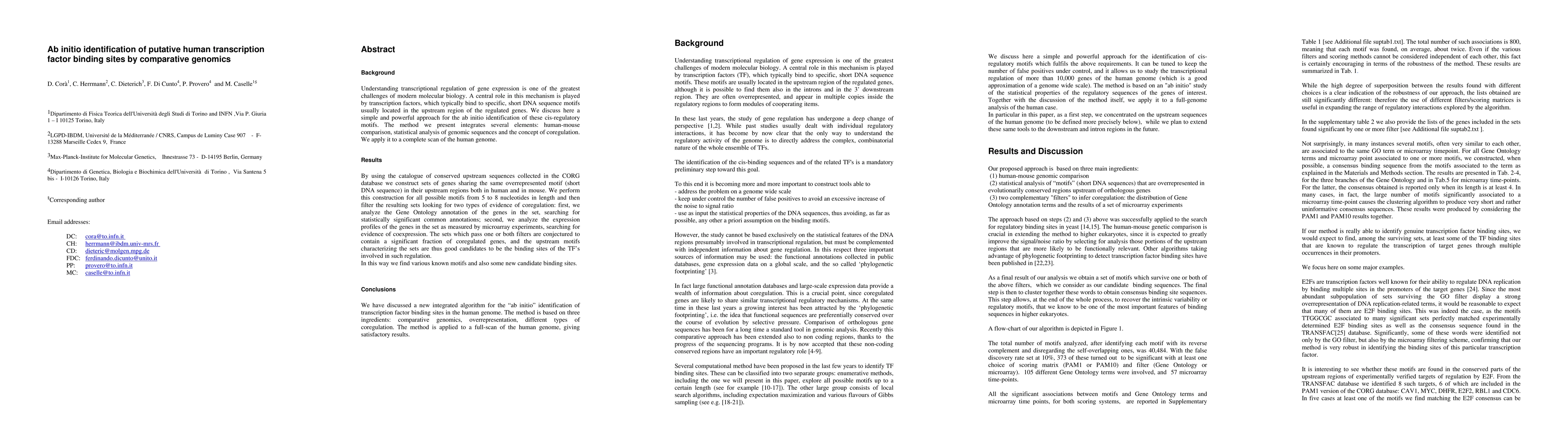 We discuss a simple and powerful approach for the ab initio identification of cis-regulatory motifs involved in transcriptional regulation. The method we present integrates several elements: human-mouse comparison, statistical analysis of genomic sequences and the concept of coregulation. We apply it to a complete scan of the human genome. By using the catalogue of conserved upstream sequences collected in the CORG database we construct sets of genes sharing the same overrepresented motif (short DNA sequence) in their upstream regions both in human and in mouse. We perform this construction for all possible motifs from 5 to 8 nucleotides in length and then filter the resulting sets looking for two types of evidence of coregulation: first, we analyze the Gene Ontology annotation of the genes in the set, searching for statistically significant common annotations; second, we analyze the expression profiles of the genes in the set as measured by microarray experiments, searching for evidence of coexpression. The sets which pass one or both filters are conjectured to contain a significant fraction of coregulated genes, and the upstream motifs characterizing the sets are thus good candidates to be the binding sites of the TF's involved in such regulation. In this way we find various known motifs and also some new candidate binding sites.