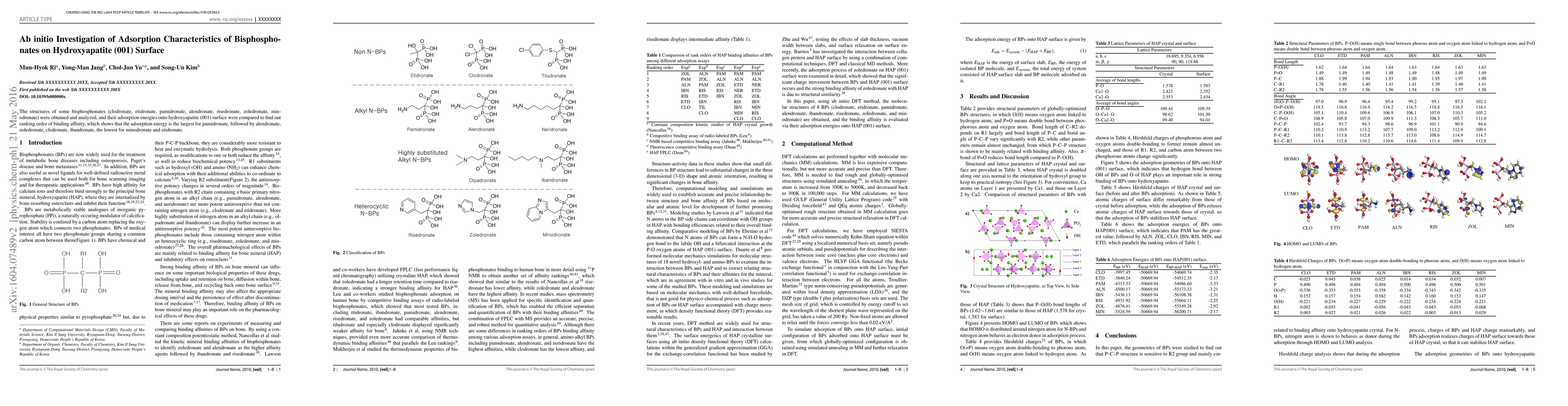 The structures of some bisphosphonates (clodronate, etidronate, pamidronate, alendronate, risedronate, zoledronate, minodronate) were obtained and analyzed, and their adsorption energies onto hydroxyapatite (001) surface were compared to find out ranking order of binding affinity, which shows that the adsorption energy is the largest for pamidronate, followed by alendronate, zoledronate, clodronate, ibandronate, the lowest for minodronate and etidronate.