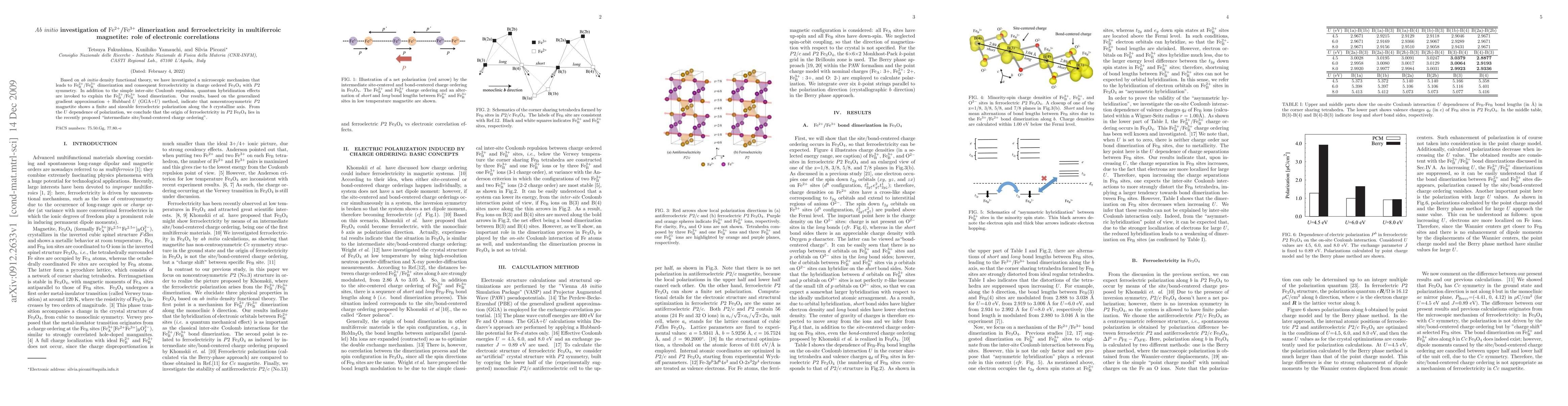 This study uses ab initio density functional theory to explore Fe$^{2+}$/Fe$^{3+}$ dimerization and ferroelectricity in magnetite, attributing the ferroelectric polarization to quantum hybridization effects and electronic correlations. The GGA+$U$ method reveals that noncentrosymmetric $P2$ magnetite exhibits significant ferroelectricity due to "intermediate site/bond-centered charge ordering."