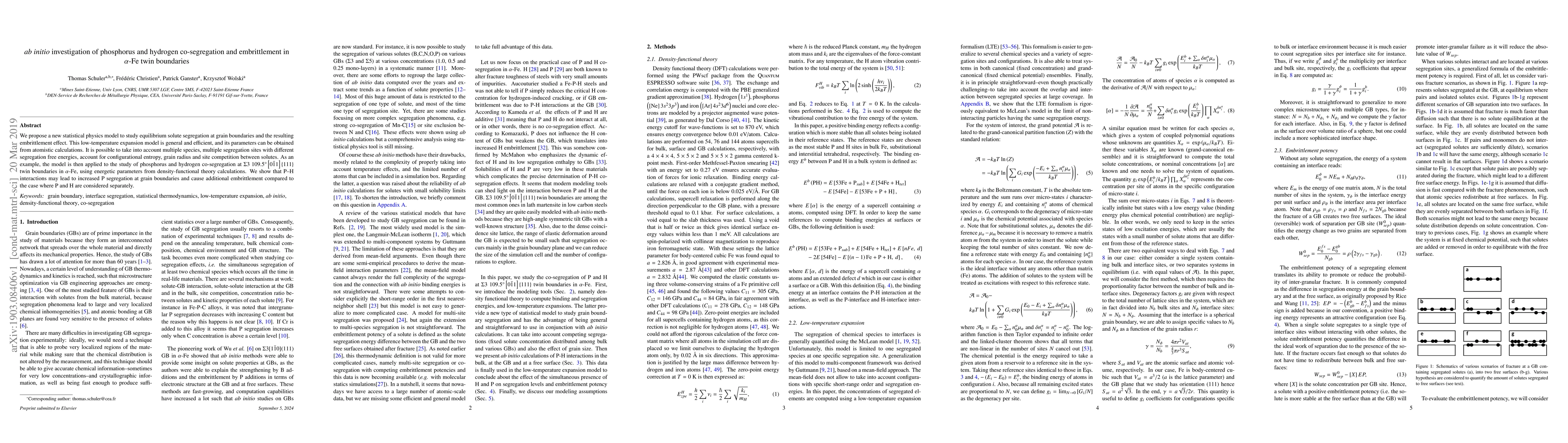 This paper introduces a new statistical physics model for studying solute segregation at grain boundaries and its embrittlement effects, demonstrating its application to phosphorus and hydrogen co-segregation at $\Sigma3$ twin boundaries in $\alpha$-Fe, revealing that P-H interactions enhance P segregation and embrittlement.