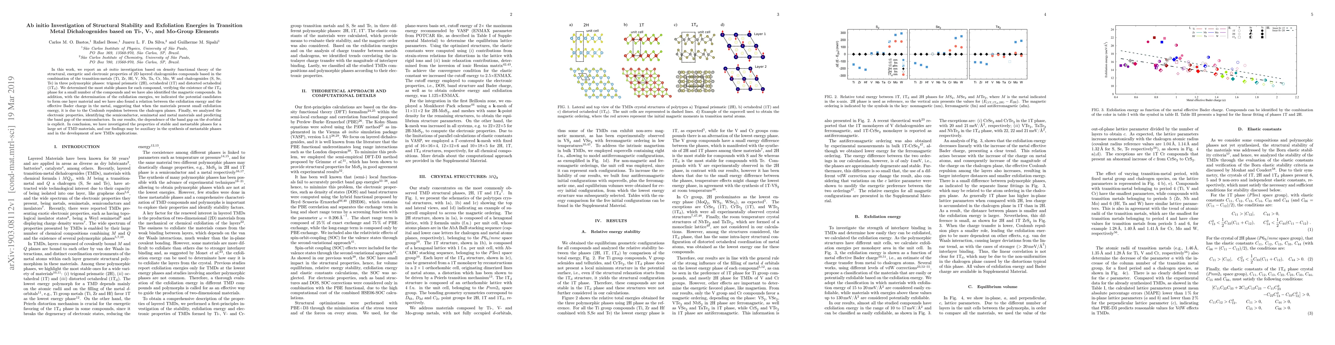 In this work, we report an ab initio investigation based on density functional theory of the structural, energetic and electronic properties of 2D layered chalcogenides compounds based in the combination of the transition-metals (Ti, Zr, Hf, V, Nb, Ta, Cr, Mo, W and chalcogenides (S, Se, Te) in three polymorphic phases: trigonal prismatic (2H), octahedral (1T) and distorted octahedral (1T$_{\text{d}}$). We determined the most stable phases for each compound, verifying the existence of the 1T$_{\text{d}}$ phase for a small number of the compounds and we have also identified the magnetic compounds. In addition, with the determination of the exfoliation energies, we indicated the potential candidates to form one layer material and we have also found a relation between the exfoliation energy and the effective Bader charge in the metal, suggesting that when the materials present small exfoliation energy, it is due to the Coulomb repulsion between the chalcogen planes. Finally, we analyzed the electronic properties, identifying the semiconductor, semimetal and metal materials and predicting the band gap of the semiconductors. In our results, the dependence of the band gap on the $d$-orbital is explicit. In conclusion, we have investigated the properties of stable and metastable phases for a large set of TMD materials, and our findings may be auxiliary in the synthesis of metastable phases and in the development of new TMDs applications.