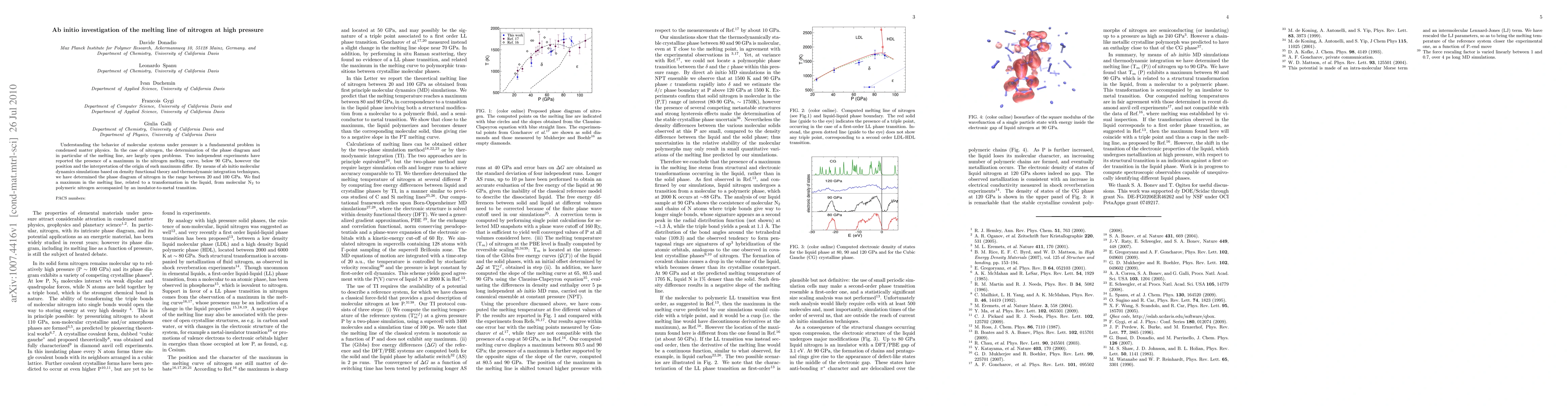 This paper uses ab initio molecular dynamics simulations to determine nitrogen's phase diagram and melting line up to 100 GPa, finding a maximum in the melting line due to a liquid transformation from molecular N_2 to polymeric nitrogen, accompanied by an insulator-to-metal transition.