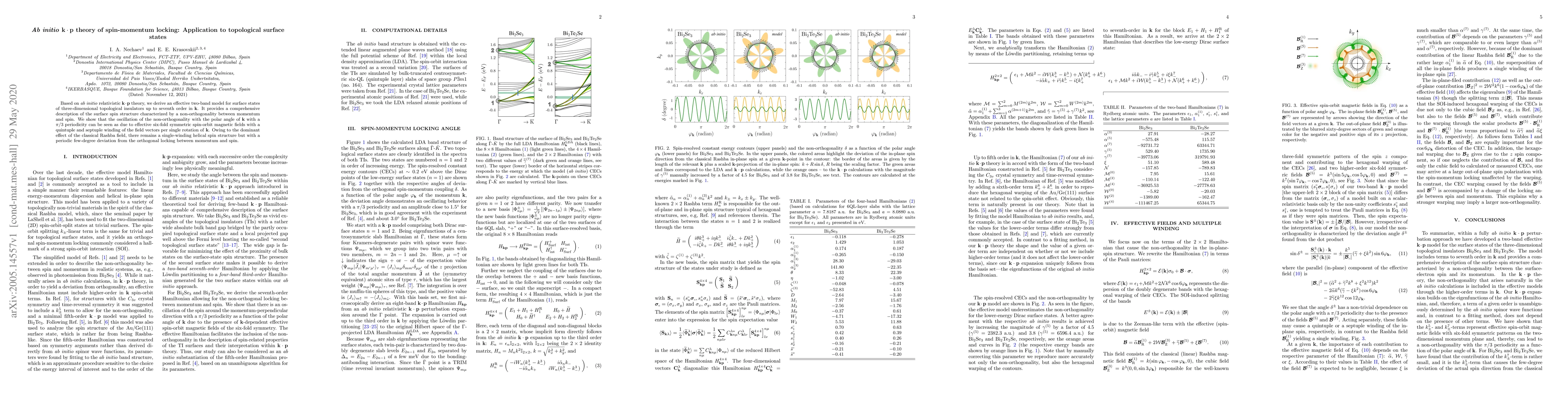 This research derives an effective model for topological surface states using ab initio k.p theory, revealing a non-orthogonality between momentum and spin oscillating with a polar angle. The model identifies six-fold symmetric spin-orbit magnetic fields causing this behavior, while a dominant Rashba field maintains a helical spin structure with periodic deviations from orthogonal locking.