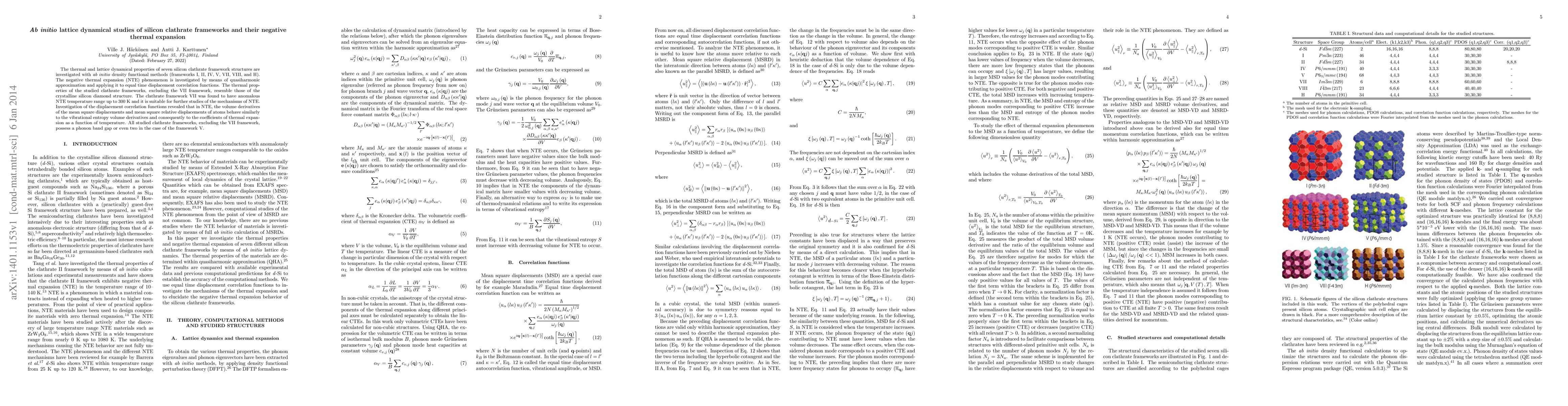 The thermal and lattice dynamical properties of seven silicon clathrate framework structures are investigated with ab initio density functional methods (frameworks I, II, IV, V, VII, VIII, and H). The negative thermal expansion (NTE) phenomenon is investigated by means of quasiharmonic approximation and applying it to equal time displacement correlation functions. The thermal properties of the studied clathrate frameworks, excluding the VII framework, resemble those of the crystalline silicon diamond structure. The clathrate framework VII was found to have anomalous NTE temperature range up to 300 K and it is suitable for further studies of the mechanisms of NTE. Investigation of the displacement correlation functions revealed that in NTE, the volume derivatives of the mean square displacements and mean square relative displacements of atoms behave similarly to the vibrational entropy volume derivatives and consequently to the coefficients of thermal expansion as a function of temperature. All studied clathrate frameworks, excluding the VII framework, possess a phonon band gap or even two in the case of the framework V.