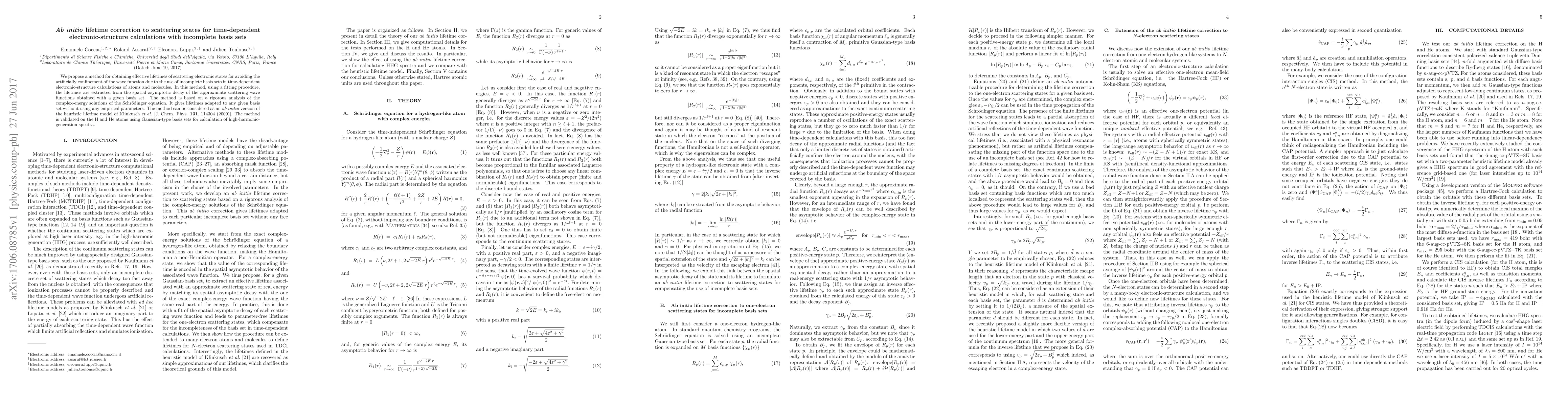 We propose a method for obtaining effective lifetimes of scattering electronic states for avoiding the artificially confinement of the wave function due to the use of incomplete basis sets in time-dependent electronic-structure calculations of atoms and molecules. In this method, using a fitting procedure, the lifetimes are extracted from the spatial asymptotic decay of the approximate scattering wave functions obtained with a given basis set. The method is based on a rigorous analysis of the complex-energy solutions of the Schr{\"o}dinger equation. It gives lifetimes adapted to any given basis set without using any empirical parameters. The method can be considered as an ab initio version of the heuristic lifetime model of Klinkusch et al. [J. Chem. Phys. 131, 114304 (2009)]. The method is validated on the H and He atoms using Gaussian-type basis sets for calculation of high-harmonic-generation spectra.