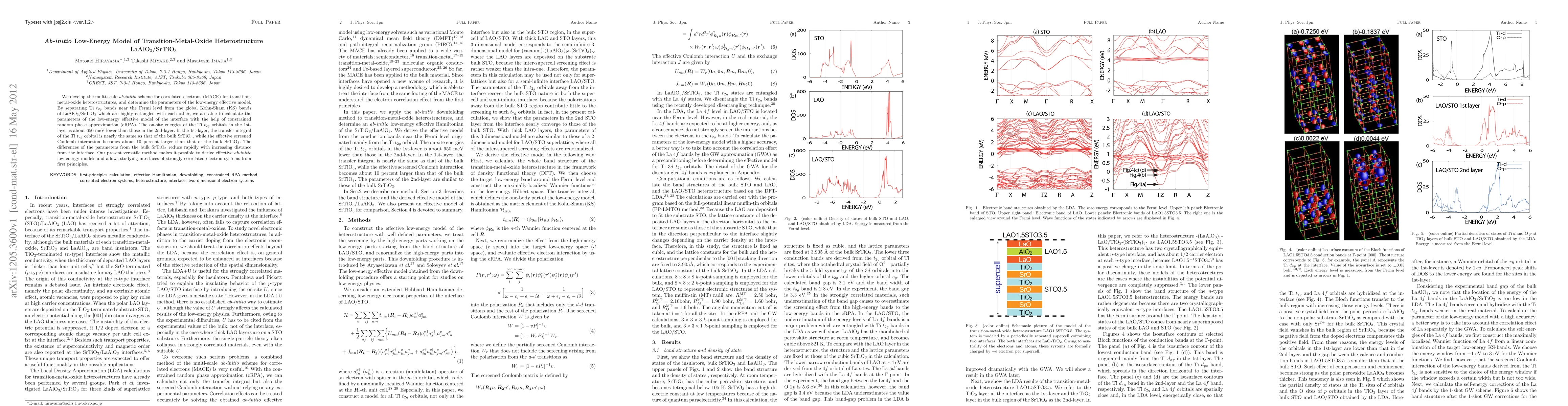We develop the multi-scale ab-initio scheme for correlated electrons (MACE) for transitionmetal-oxide heterostructures, and determine the parameters of the low-energy effective model. By separating Ti t2g bands near the Fermi level from the global Kohn-Sham (KS) bands of LaAlO3/SrTiO3 which are highly entangled with each other, we are able to calculate the parameters of the low-energy effective model of the interface with the help of constrained random phase approximation (cRPA). The on-site energies of the Ti t2g orbitals in the 1stlayer is about 650 meV lower than those in the 2nd-layer. In the 1st-layer, the transfer integral of the Ti t2g orbital is nearly the same as that of the bulk SrTiO3, while the effective screened Coulomb interaction becomes about 10 percent larger than that of the bulk SrTiO3. The differences of the parameters from the bulk SrTiO3 reduce rapidly with increasing distance from the interface. Our present versatile method makes it possible to derive effective ab-initio low-energy models and allows studying interfaces of strongly correlated electron systems from first principles.