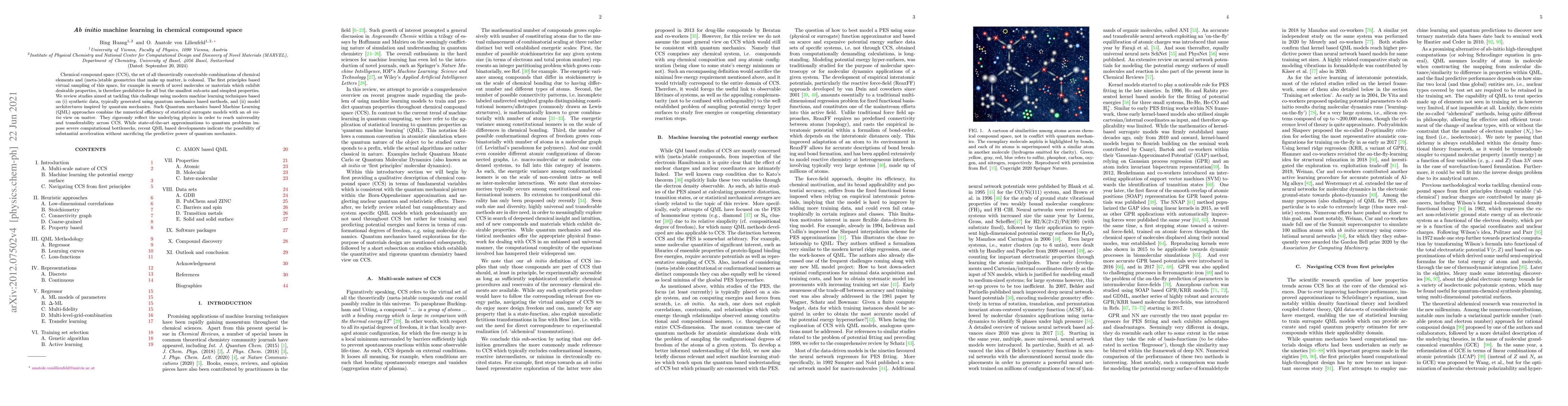 Chemical compound space (CCS), the set of all theoretically conceivable combinations of chemical elements and (meta-)stable geometries that make up matter, is colossal. The first principles based virtual sampling of this space, for example in search of novel molecules or materials which exhibit desirable properties, is therefore prohibitive for all but the smallest sub-sets and simplest properties. We review studies aimed at tackling this challenge using modern machine learning techniques based on (i) synthetic data, typically generated using quantum mechanics based methods, and (ii) model architectures inspired by quantum mechanics. Such Quantum mechanics based Machine Learning (QML) approaches combine the numerical efficiency of statistical surrogate models with an {\em ab initio} view on matter. They rigorously reflect the underlying physics in order to reach universality and transferability across CCS. While state-of-the-art approximations to quantum problems impose severe computational bottlenecks, recent QML based developments indicate the possibility of substantial acceleration without sacrificing the predictive power of quantum mechanics.