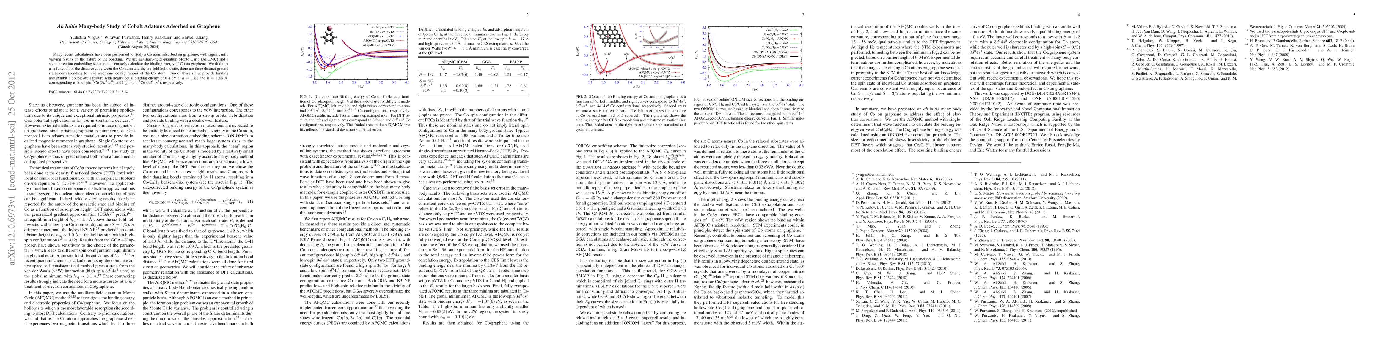 Many recent calculations have been performed to study a Co atom adsorbed on graphene, with significantly varying results on the nature of the bonding. We use auxiliary-field quantum Monte Carlo (AFQMC) and a size-correction embedding scheme to accurately calculate the binding energy of Co on graphene. We find that as a function of the distance h between the Co atom and the six-fold hollow site, there are three distinct ground states corresponding to three electronic configurations of the Co atom. Two of these states provide binding and exhibit a double-well feature with nearly equal binding energy of 0.4 eV at h = 1.51 and h = 1.65 angstroms, corresponding to low-spin $^2$Co (3d9 4s0) and high-spin $^4$Co (3d8 4s1), respectively.