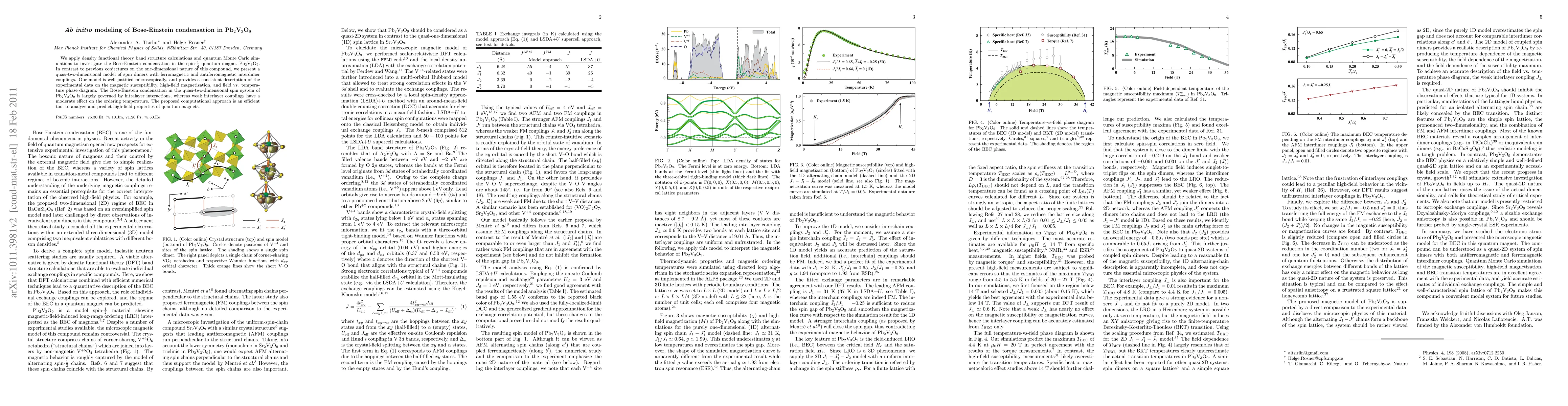 This study employs density functional theory and quantum Monte Carlo simulations to model Bose-Einstein condensation in Pb2V3O9, revealing a quasi-two-dimensional spin-dimer structure. The findings show that intralayer interactions primarily determine the condensation, while interlayer couplings moderately affect the ordering temperature.