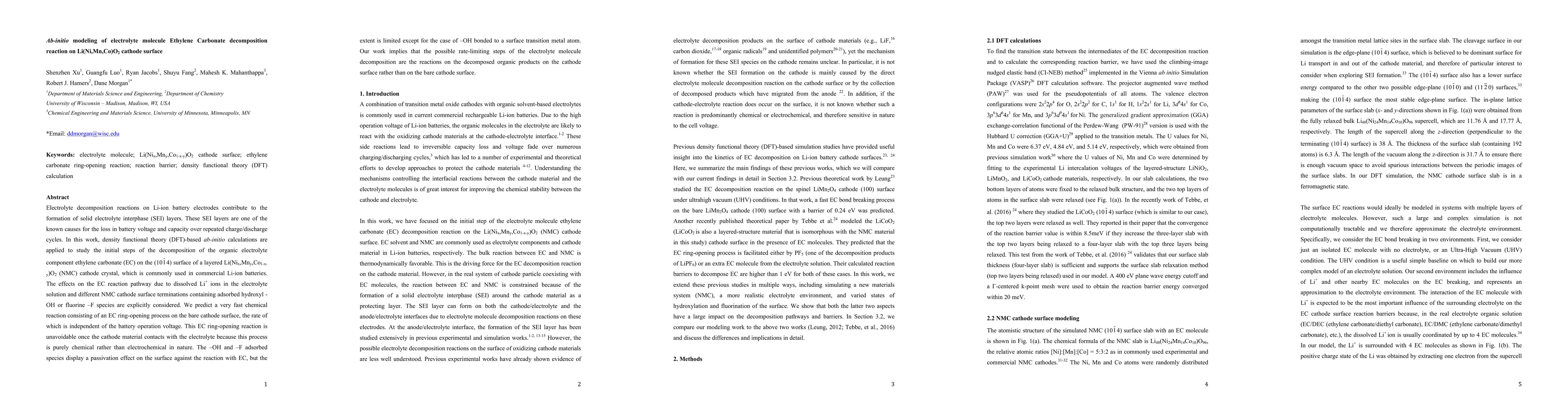 This study uses density functional theory to model the decomposition of ethylene carbonate on Li(Ni,Mn,Co)O2 cathode surfaces, revealing a fast chemical ring-opening reaction independent of voltage. Adsorbed -OH and -F species partially inhibit the reaction, suggesting that decomposed organic products may be the rate-limiting step in the process.
