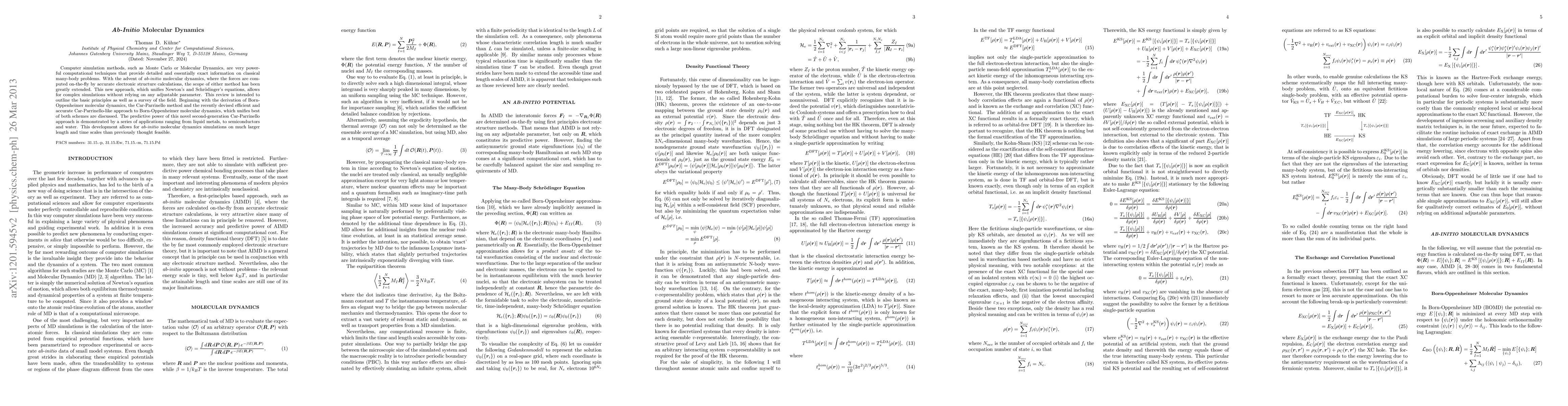 This paper reviews ab-initio molecular dynamics, integrating quantum mechanics and classical mechanics to simulate complex systems without adjustable parameters. It discusses advanced methods like Born-Oppenheimer molecular dynamics and the second-generation Car-Parrinello approach, demonstrating their applications in various materials and their enhanced scalability.