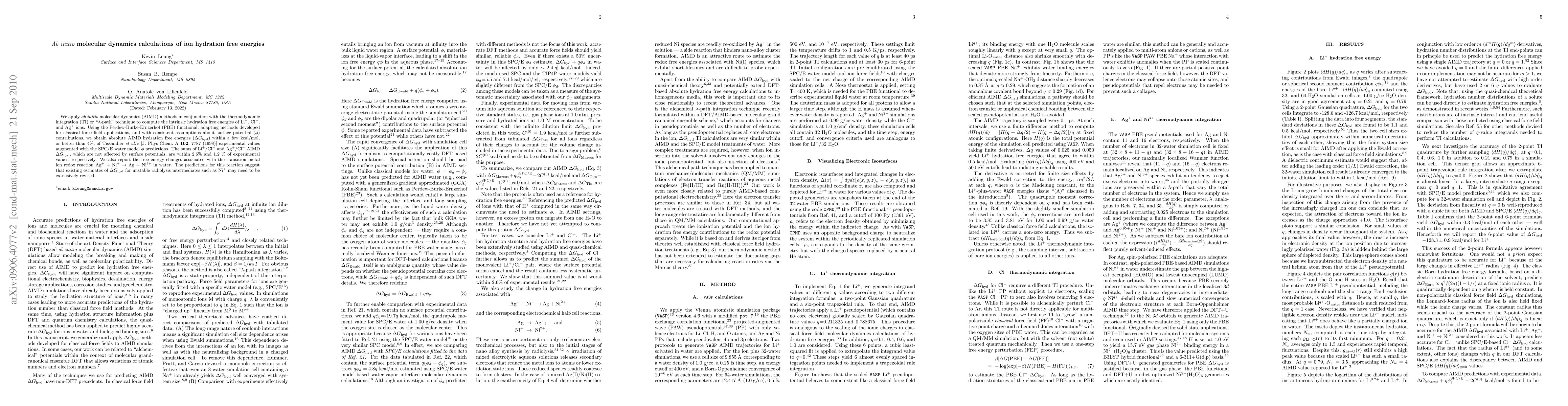This paper uses ab initio molecular dynamics (AIMD) to calculate the intrinsic hydration free energies of Li+, Cl-, and Ag+ ions, achieving results within 4% of experimental values. It also reports free energy changes for the redox reaction Ag++Ni+ -> Ag+Ni2+ in water, suggesting a need for revisions in existing estimates for unstable intermediates like Ni+.