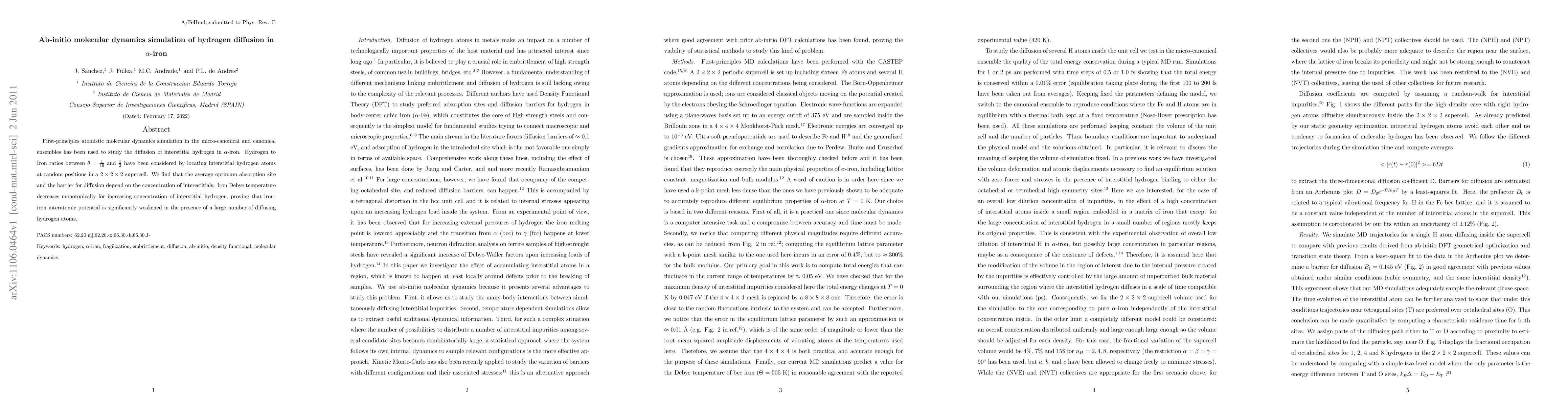 First-principles atomistic molecular dynamics simulation in the micro-canonical and canonical ensembles has been used to study the diffusion of interstitial hydrogen in $\alpha$-iron. Hydrogen to Iron ratios between $\theta=1/16 and 1/2 have been considered by locating interstitial hydrogen atoms at random positions in a $2 \times 2 \times 2$ supercell. We find that the average optimum absorption site and the barrier for diffusion depend on the concentration of interestitials. Iron Debye temperature decreases monotonically for increasing concentration of interstitial hydrogen, proving that iron-iron interatomic potential is significantly weakened in the presence of a large number of diffusing hydrogen atoms.