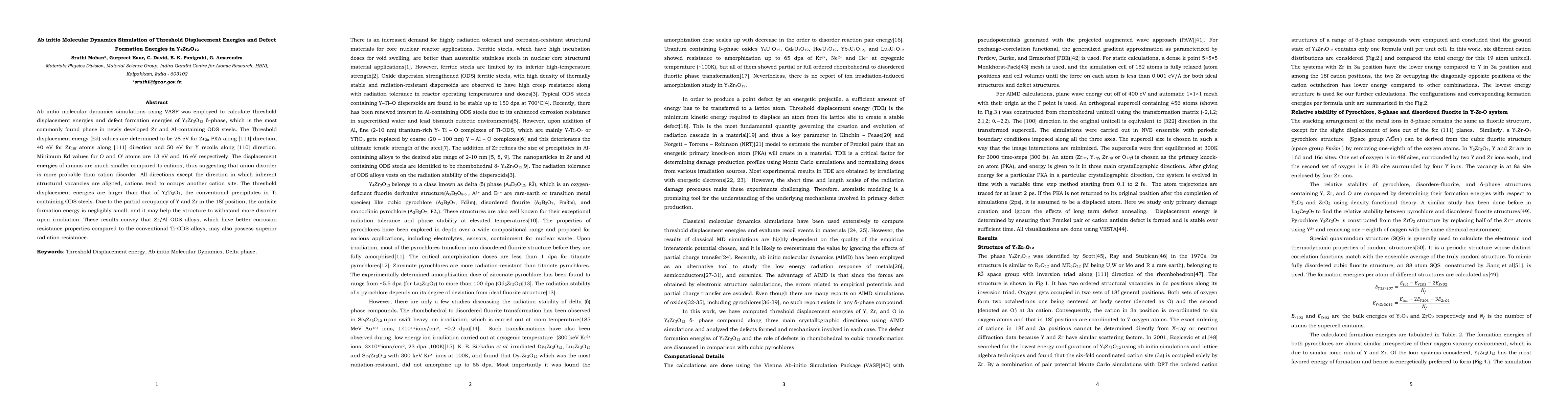 This study uses ab initio molecular dynamics to determine threshold displacement energies and defect formation energies in Y4Zr3O12, finding that cations are harder to displace than anions, suggesting greater anion disorder. The results indicate that Zr/Al ODS alloys may have superior radiation resistance compared to conventional Ti-ODS alloys due to their larger displacement energies and negligible antisite formation energy.