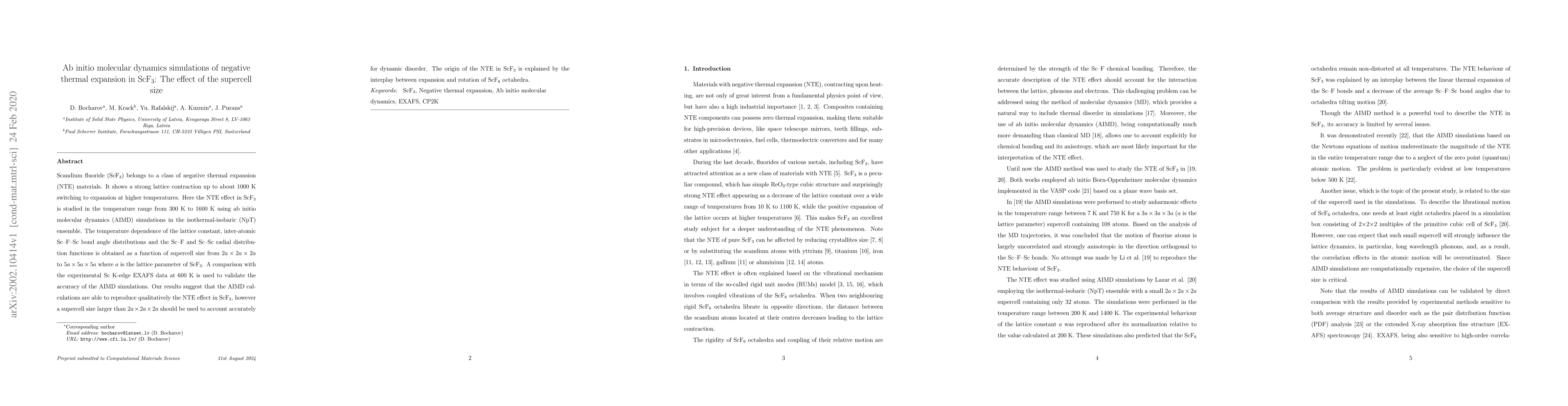 This study uses ab initio molecular dynamics simulations to investigate the negative thermal expansion (NTE) in ScF3, finding that larger supercell sizes better capture dynamic disorder. The simulations reveal the NTE effect is due to the interplay between expansion and rotation of ScF6 octahedra.